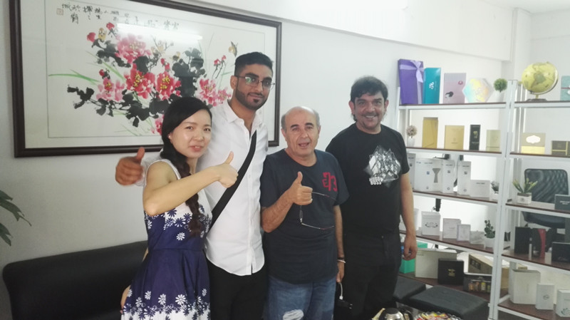 Raji, der GM von Global Perfumes Industry FZE aus den VAE, besuchte 2017 mit seinem Assistenten unsere Fabrik. Er möchte ein besonderes gestaltete Parfümschachteln um seine Marke einzigartig zu machen.