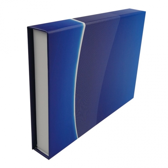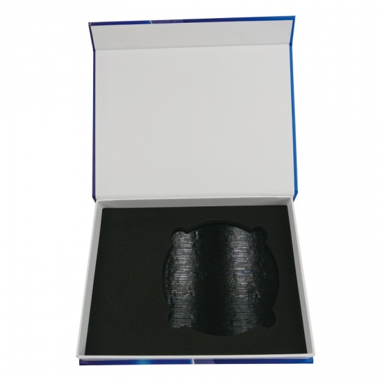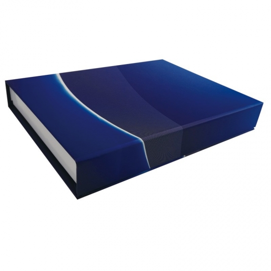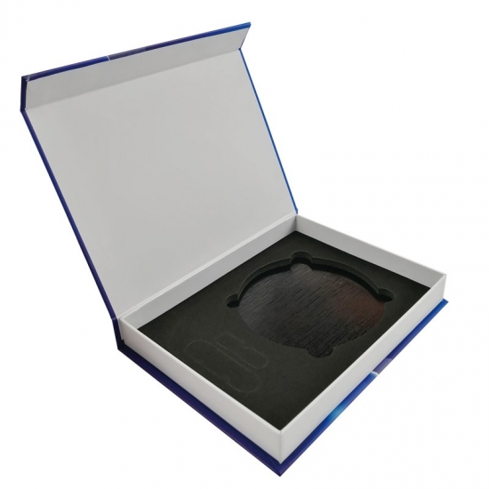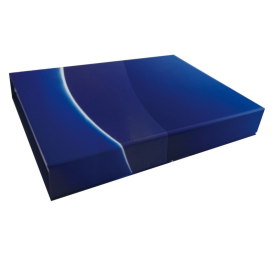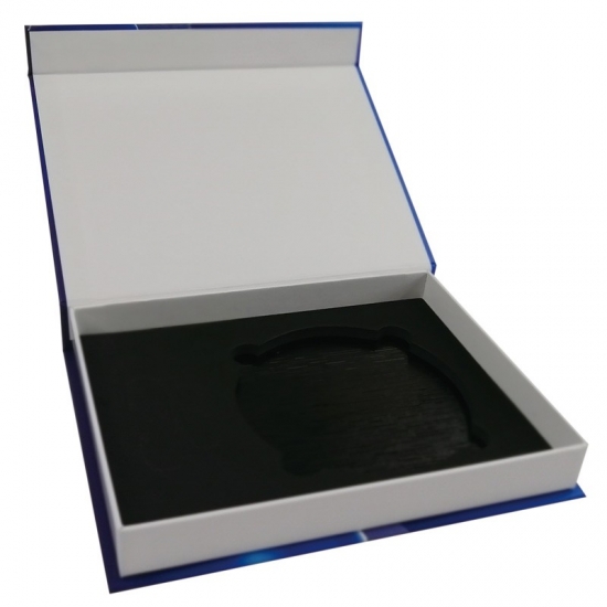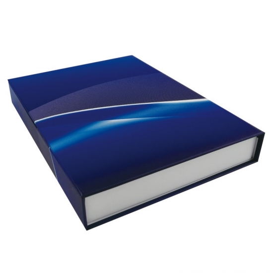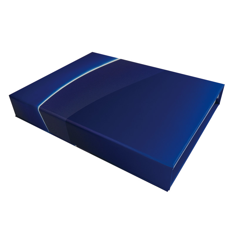 Dies ist ein Baby-Erinnerungsbox mit Magnetverschluss was machte aus 157 g C2S-Kunstdruckpapier + 2 mm Graupappe, Außenseite der Schachtel voller blauer Farbverlaufsdruck, Innenseite der Schachtel schlicht weiß und EVA, das nach Ihren Wünschen individuell geformt werden kann.