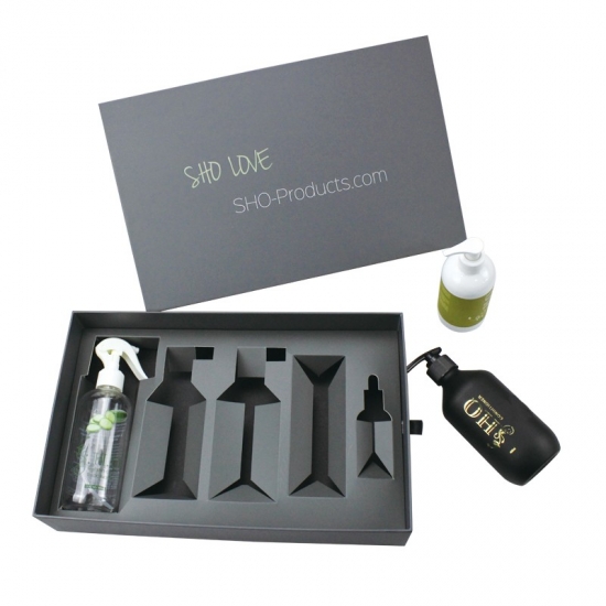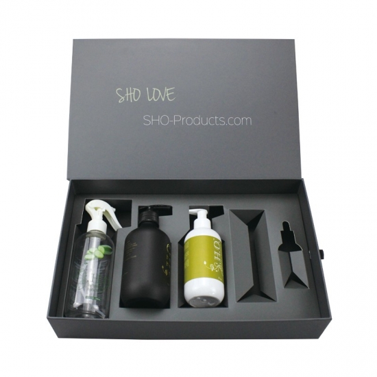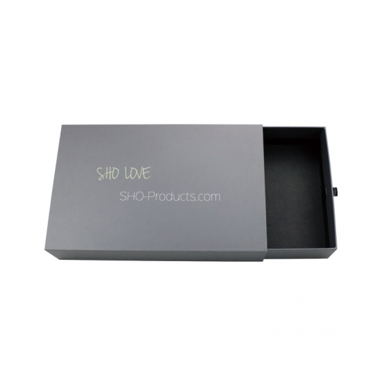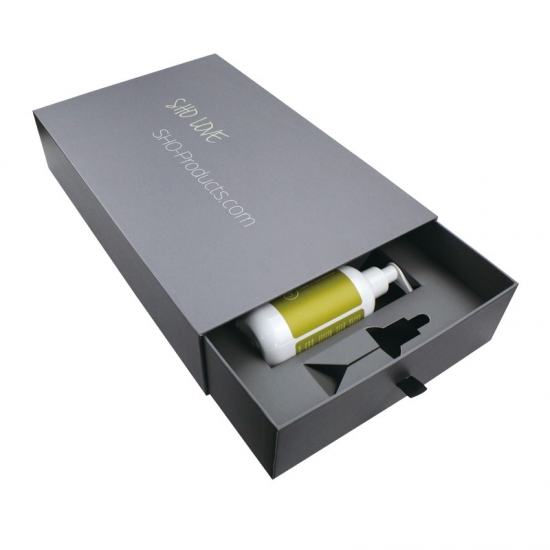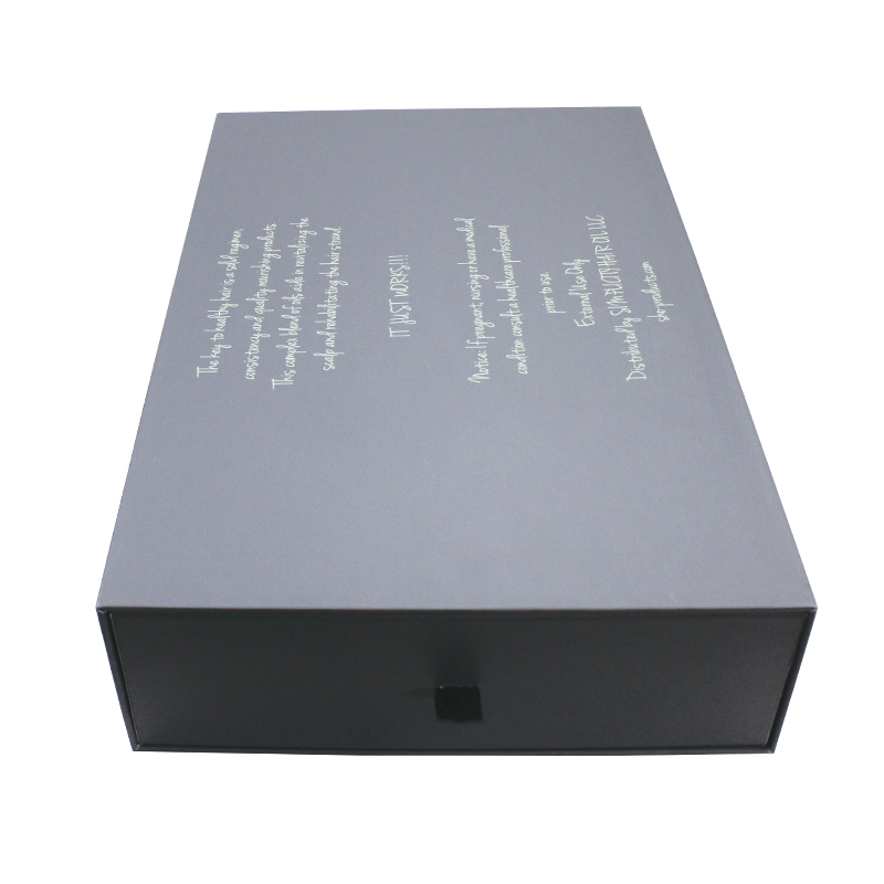 Es ist eine matte graue Farbe Beauty-Hautpflege-Schiebeschubladenbox was machte von 157 g C2S-Kunstdruckpapier + 1200 g Graukarton , voller grauer Aufdruck auf der Schachtel mit maßgeschneidertem Logo und Text, die matte Oberflächenveredelung verleiht ihr ein hochwertiges und edles Aussehen.