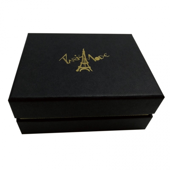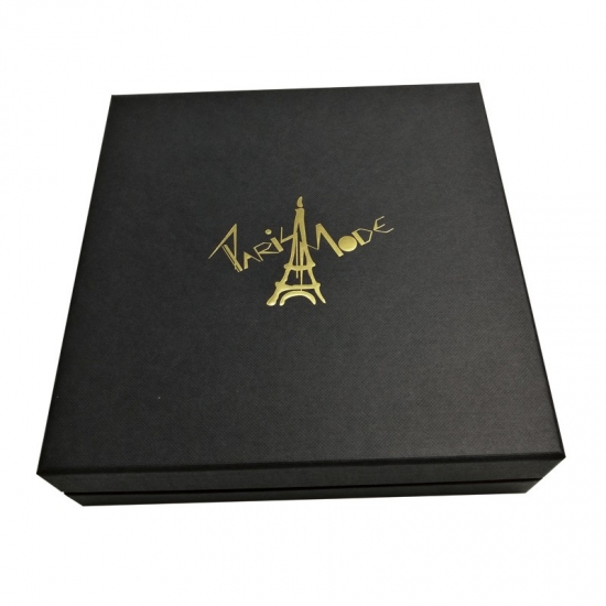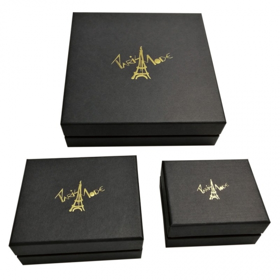 Dies ist ein Set aus einer luxuriösen schwarzen großen starren Box mit einem kleinen Geschenkdeckel und einer Basisbox. Jede Box besteht aus aus speziellem schwarzem Papier + 1200 g Graukarton und das Logo ist aus Goldfolie auf den oberen Deckeln.