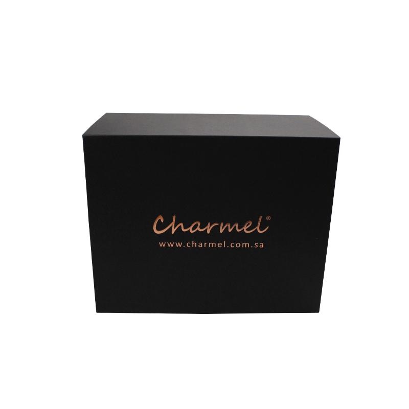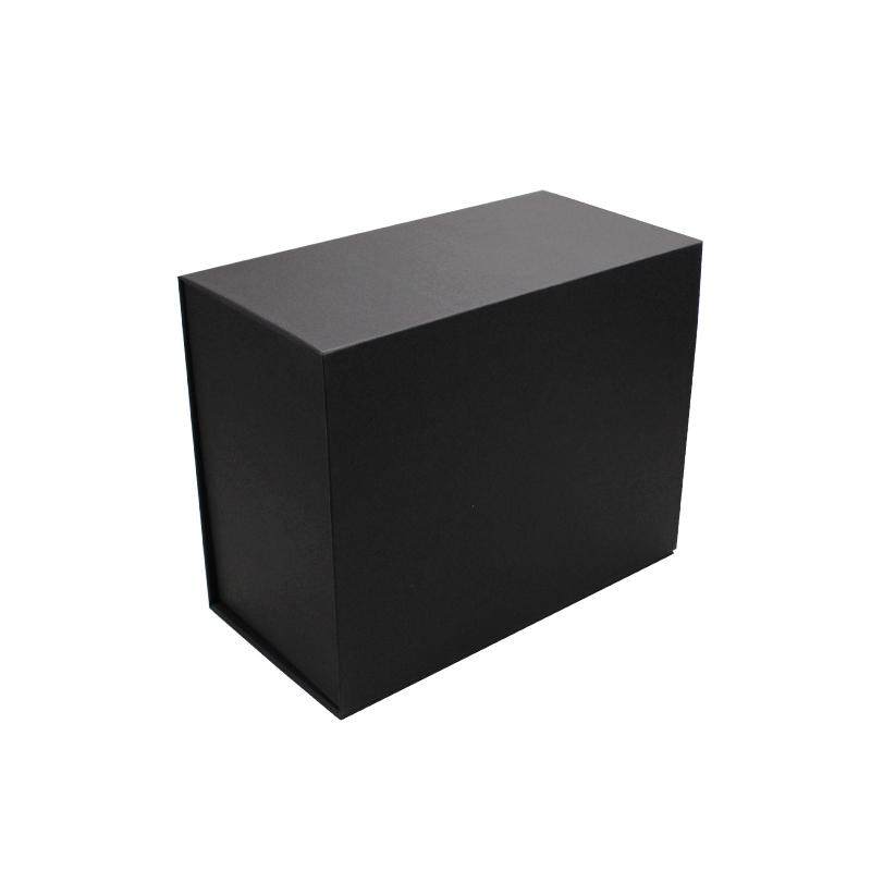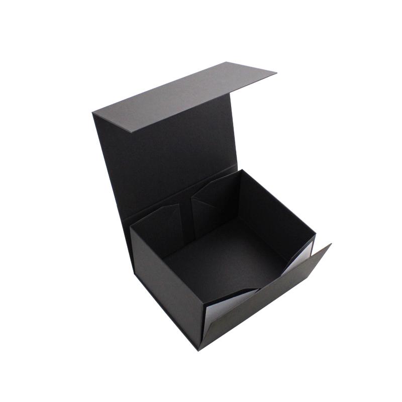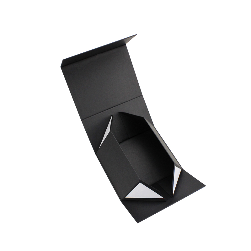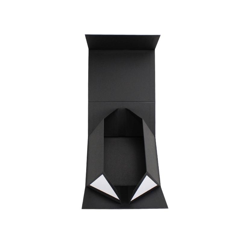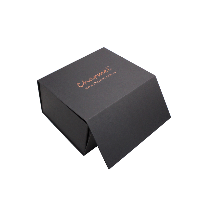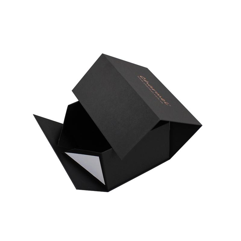 Dies ist ein schwarzes Geschenkbox faltbar mit dem Logo der Heißprägung. Fügen Sie doppelseitiges Klebeband in vier Ecken hinzu, um Ihre Box stärker zu machen