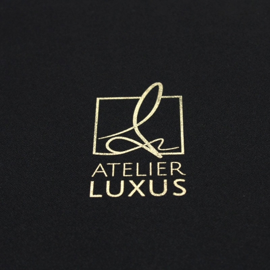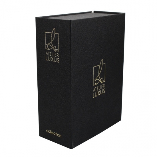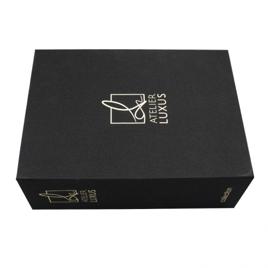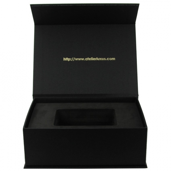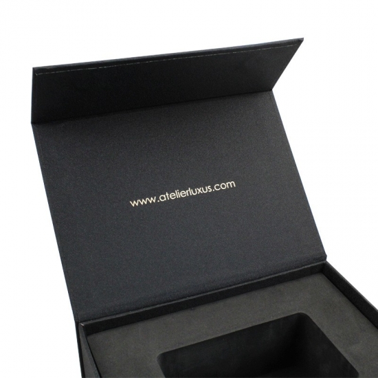 Dies ist eine schwarze Magnetklappenbox mit EVA-Schaumpolsterung was machte aus Spezialpapier mit Stoffmuster + 1200 g Graupappe, und das Logo innen und außen ist mit Goldfolie geprägt.