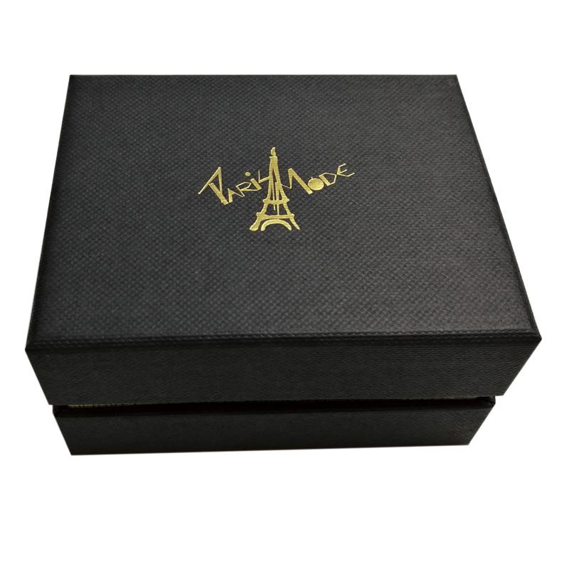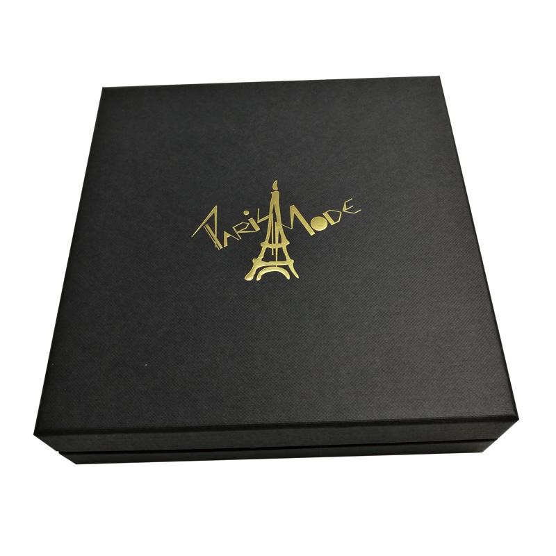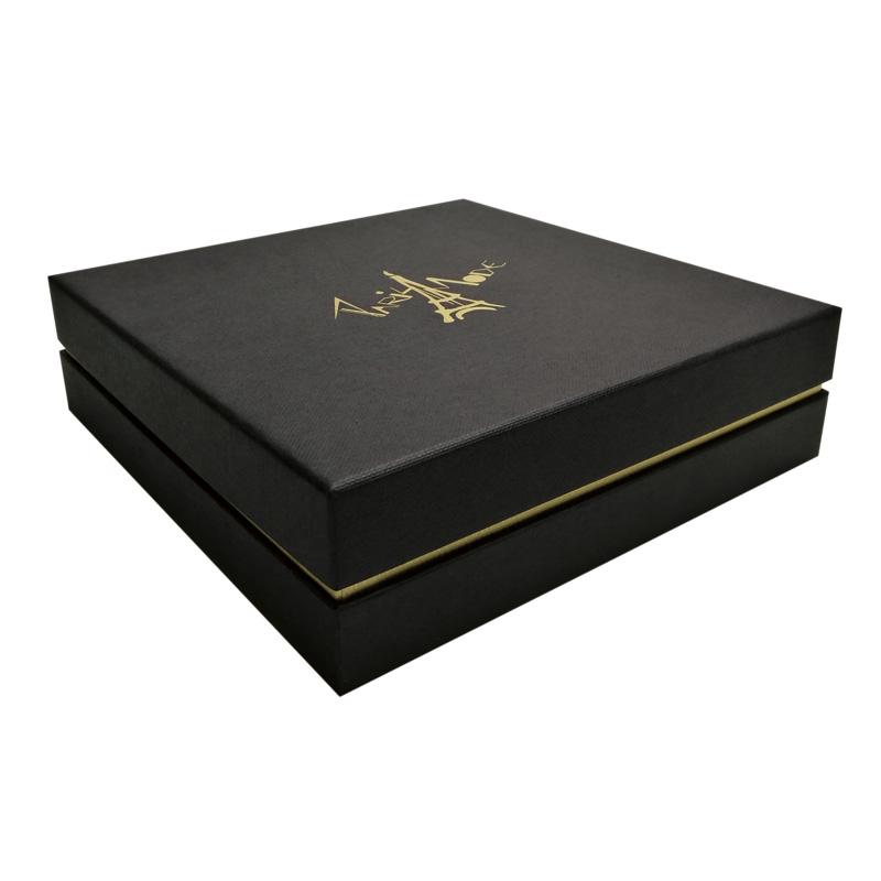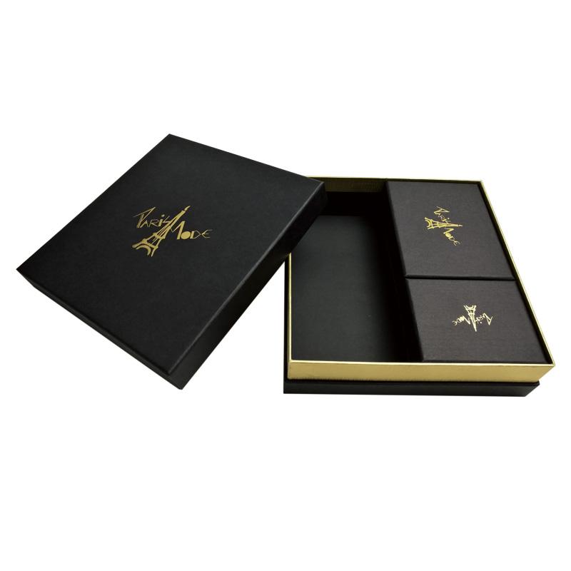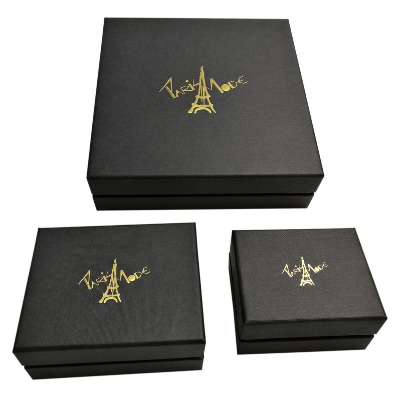 Dies ist ein Set von Luxus schwarzer Deckel und Boden der Box was machte aus Spezialstrukturpapier + 1200 g Graupappe, die Manschette des Bodens besteht aus goldenem Spezialpapier und das Logo auf der Oberseite der Schachtel ist mit Goldfolie geprägt. Es gibt eine große Schachtel für 3 kleinere Schachteln unterschiedlicher Größe.