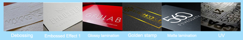 Es gibt matt/glänzend laminierte, foliengeprägte, geprägte/erhabene, UV-beschichtete usw. Ausführungen.