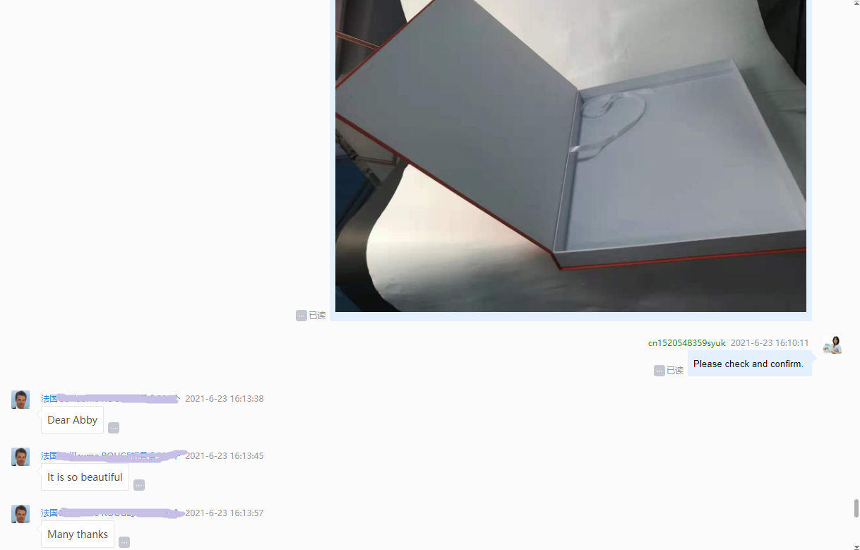 Schließlich stimmte er unserer Idee zu. Nachdem wir das Druckdesign mit ihm abgesprochen hatten, war das Muster der Box innerhalb von drei Tagen fertig. Wir haben Ihnen Bilder und Videos zur Referenz geschickt. Es gefällt ihm sehr gut.