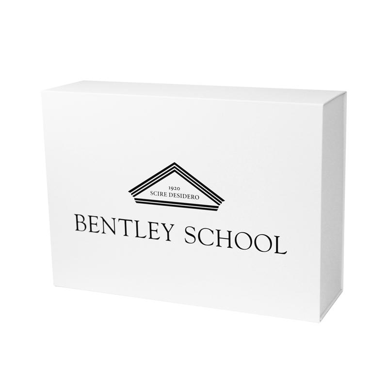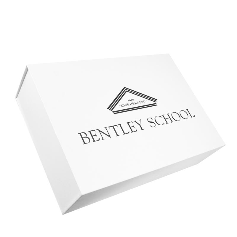 Mattweiße Geschenkbox mit individuellem, schwarz aufgedrucktem Logo, geeignet für alle Arten hochwertiger Geschenkverpackungen.