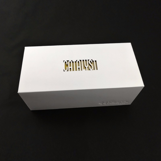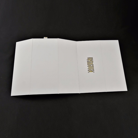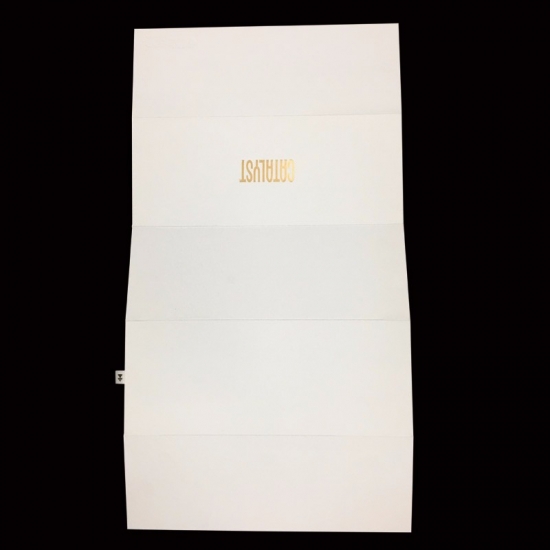 Hergestellt aus Spezialpapier + 2 mm Graupappe, außen unbedruckt, innen mit Volldruck in Sonderfarben und Logoprägung, Heißprägung in Gold.