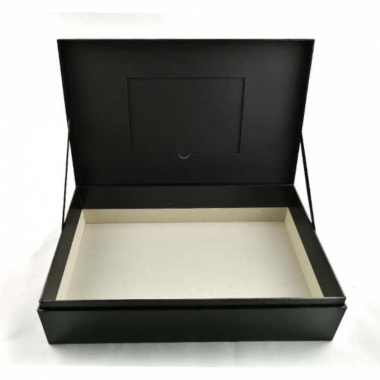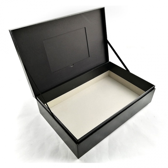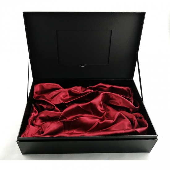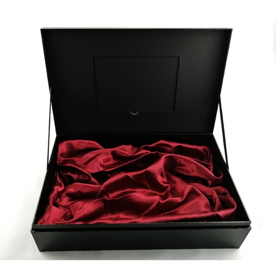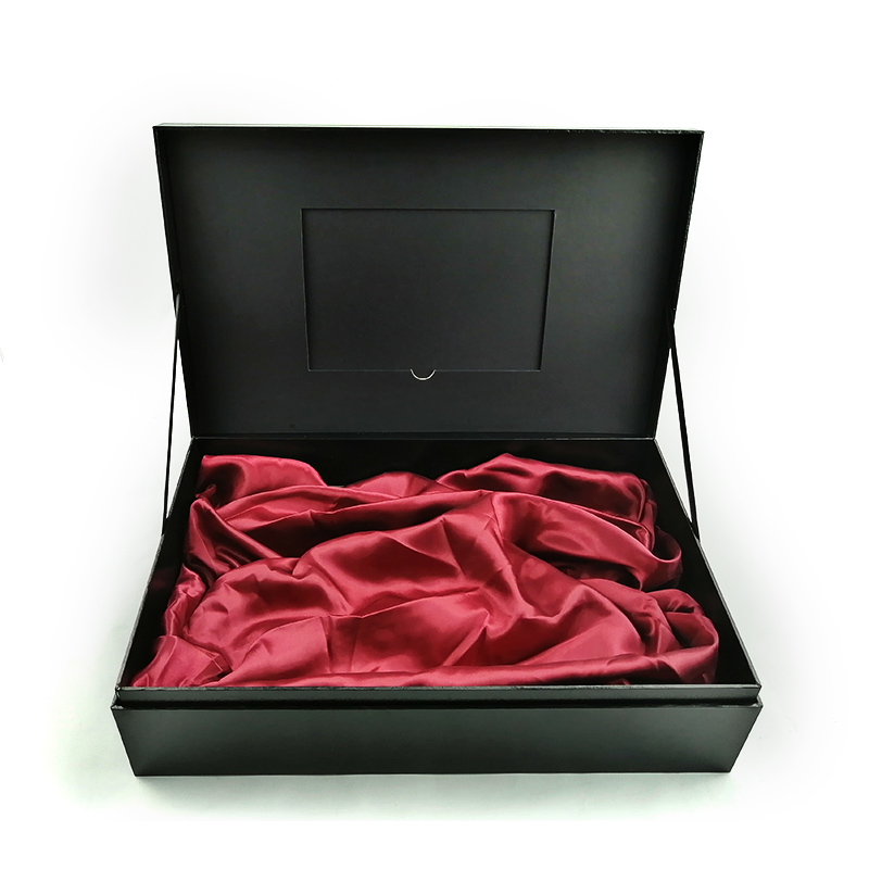Dies ist ein schwarze Clamshell-Geschenkbox was machte aus 157 g C2S-Kunstdruckpapier + 2 mm Graupappe, das Logo auf der Außenseite der Schachtel ist eine Silberfolienprägung, die die Schachtel hochwertiger und einzigartiger machen kann. Die Inneneinlage der Schachtel besteht aus hochwertigem Satin, der die Produkte in der Schachtel dekoriert.