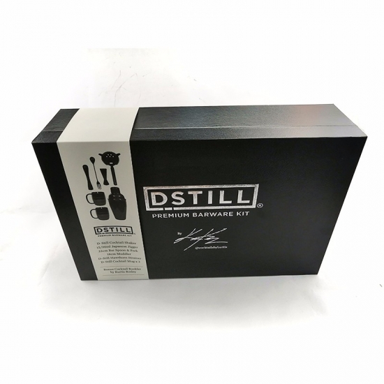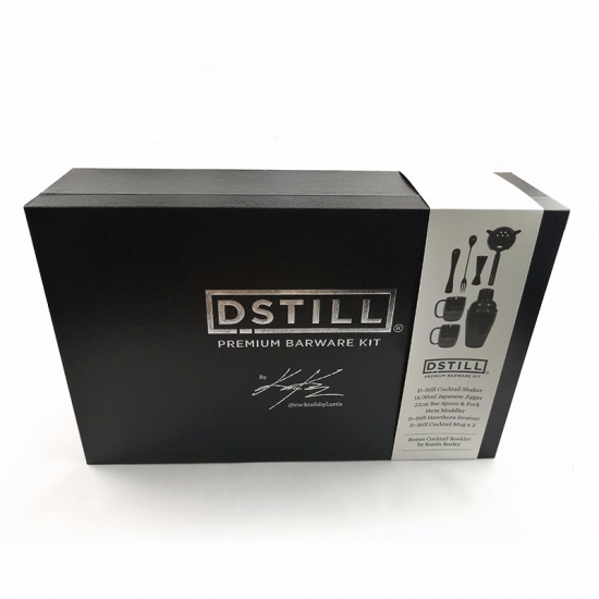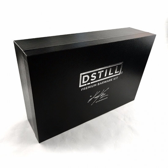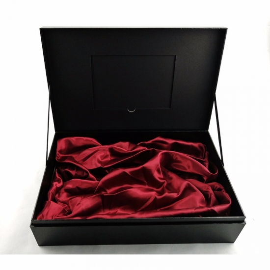 Individuelle, luxuriöse, einzigartige schwarze Geschenkbox aus Karton für Weinsets mit Papierhülle und Satinstoff.