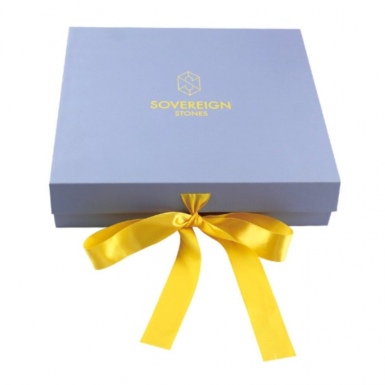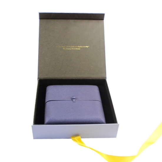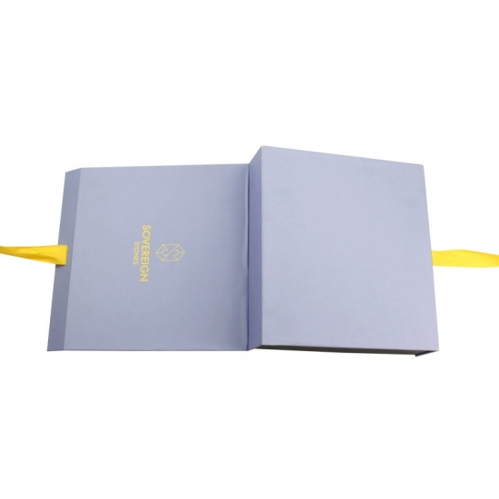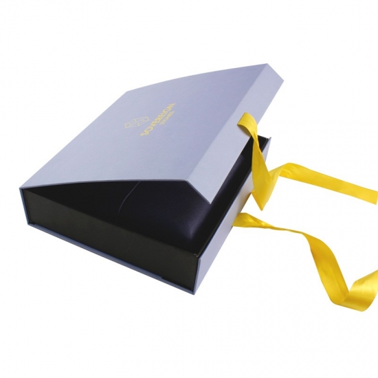 Blaue magnetische Geschenkboxen mit Band wurden aus 157 g/m² C2S-Kunstdruckpapier hergestellt, laminiert mit 2 mm grauem Karton mit EVA-Schaum und Band, unterstützt individuelle Anpassungen in jeder Größe, jeder Farbe und mit jedem Logo, Oberflächenveredelung war matte Laminierung mit Heißprägung, Größe 25 x 23 x 6 cm
