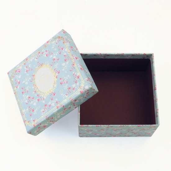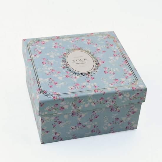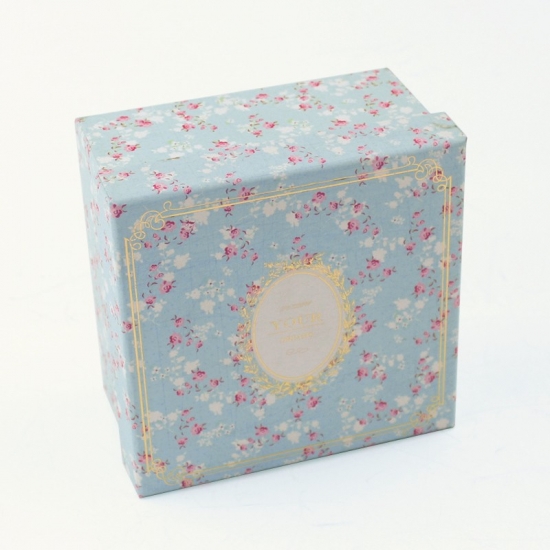 Dies ist eine individuelle blaue quadratische Geschenkbox mit romantischem Blumenmuster, Deckel und Boden aus 157 g C2S-Kunstdruckpapier + 1200 g Graupappe, Logo in Goldfolien-Heißprägung, innen schlichte rote Dekorfarbe. Größe: 12 x 12 x 12 cm.