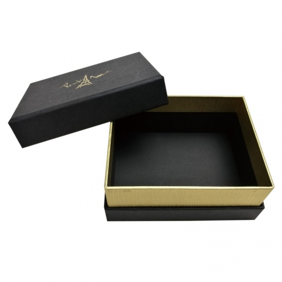 Benutzerdefinierte Setbox in einer kleinen Box mit Deckel und Basisbox mit goldener Manschette, hergestellt aus schwarzem Spezialpapier + 1200 g Graupappe, Logo-Goldfolienprägung passt gut zur Farbe der goldenen Manschette.Verwendung: Alle Arten von Produkten und Geschenkverpackungen, Parfüm, Schmuck, Kosmetik, Kleidung usw.