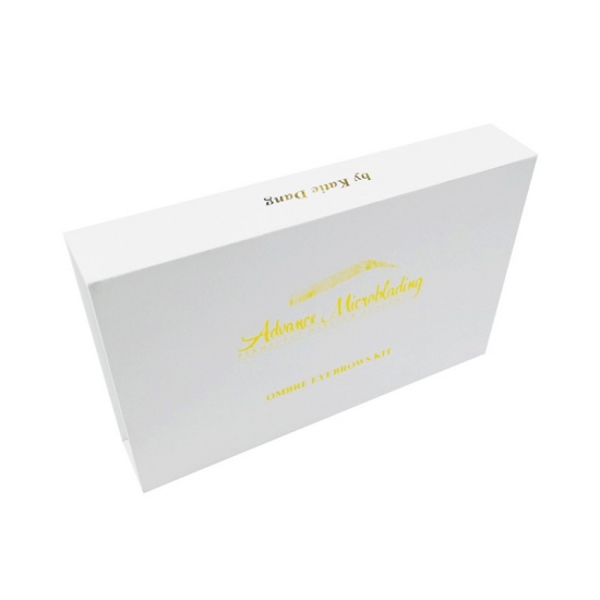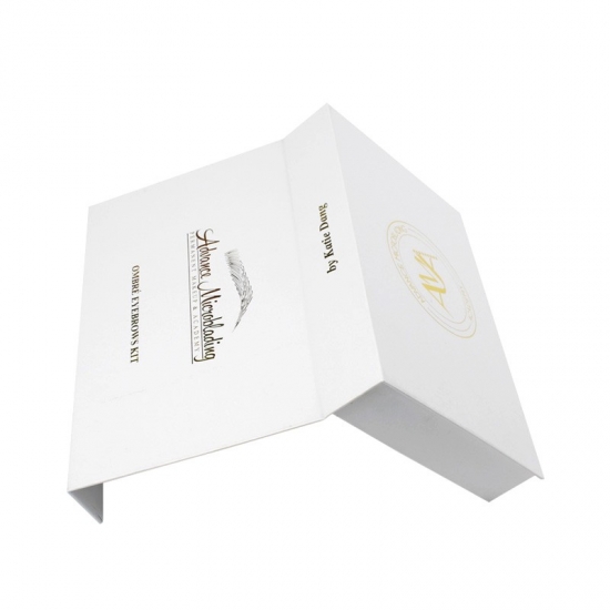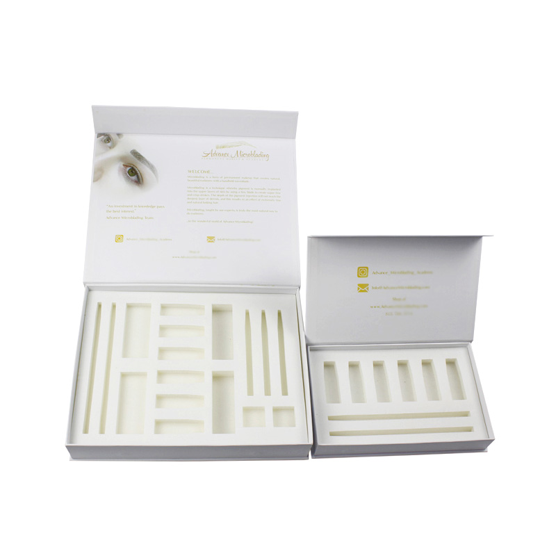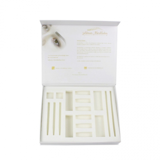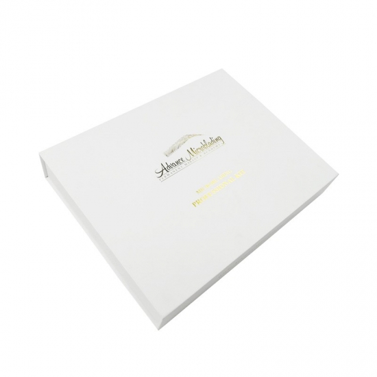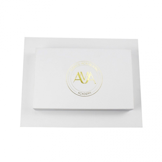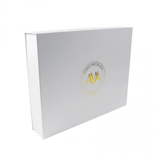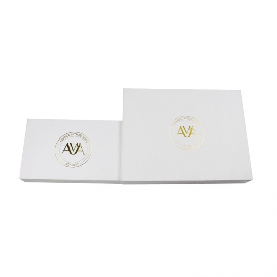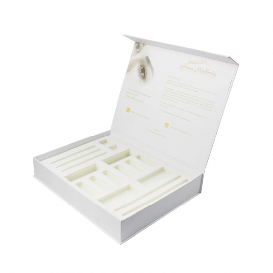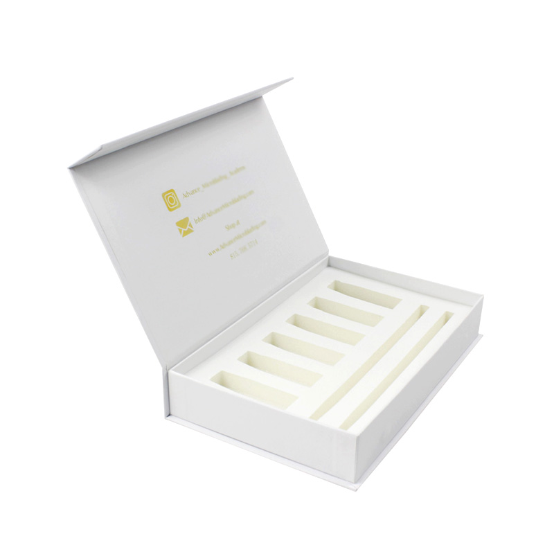 Dies ist ein weiße magnetische Verpackungsbox mit Magnetverschluss was machte aus 157 g C2S-Kunstdruckpapier + 2 mm Graupappe, das Logo auf der Außenseite der Schachtel ist eine Goldfolienprägung, die der Schachtel ein glänzendes und luxuriöses Aussehen verleiht. Im Inneren der Schachtel befindet sich ein Einleger aus einem speziell geformten Schwamm mit Samtbesatz.
