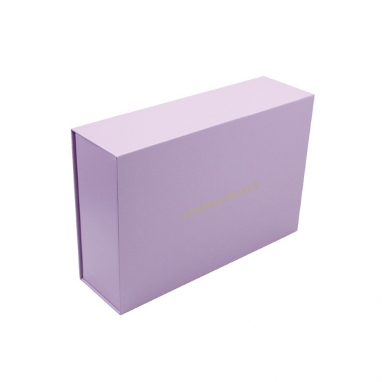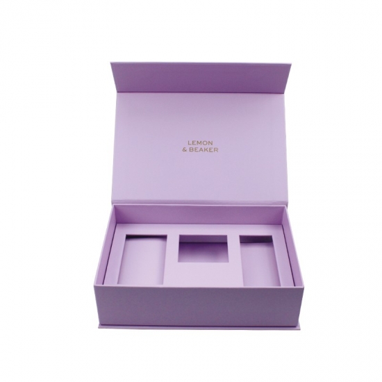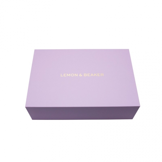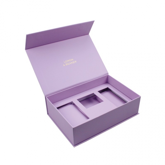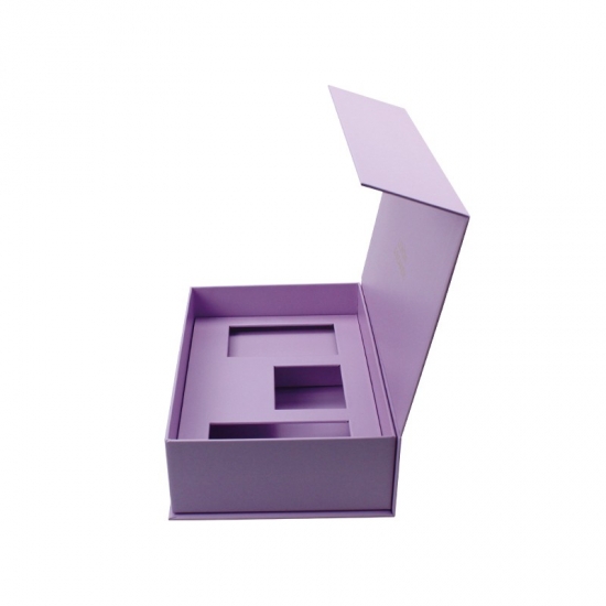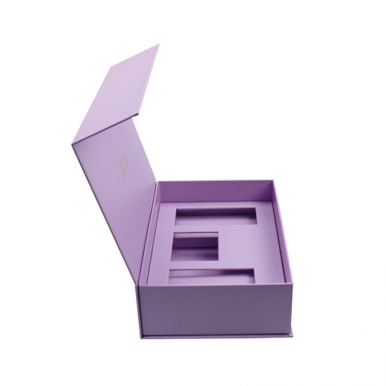 Lilafarbene, luxuriöse magnetische Geschenkboxen wurden aus 157 g/m² C2S-Kunstdruckpapier hergestellt, das mit 2 mm grauem Karton laminiert ist. Die Innenschale ist eine Papierschale. Jede Innenstütze kann individuell angepasst werden, matte Laminierung, Heißprägung des rosa Logos.
