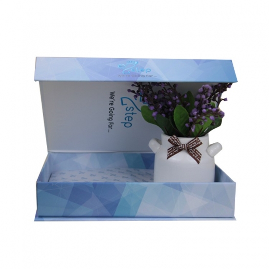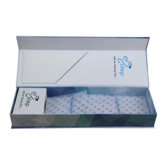 Die blaue, buchförmige Aufbewahrungsbox wurde aus 157 g/m² C2S-Kunstdruckpapier hergestellt, laminiert mit 2 mm grauem Kartonträger, individuell anpassbar in jeder Größe, jeder Farbe und mit jedem Logo, Oberflächenveredelung war matte Laminierung, Spot-UV-Beschichtung, Heißprägung (blau), Prägegröße 20,1 x 16,1 x 4,1 cm