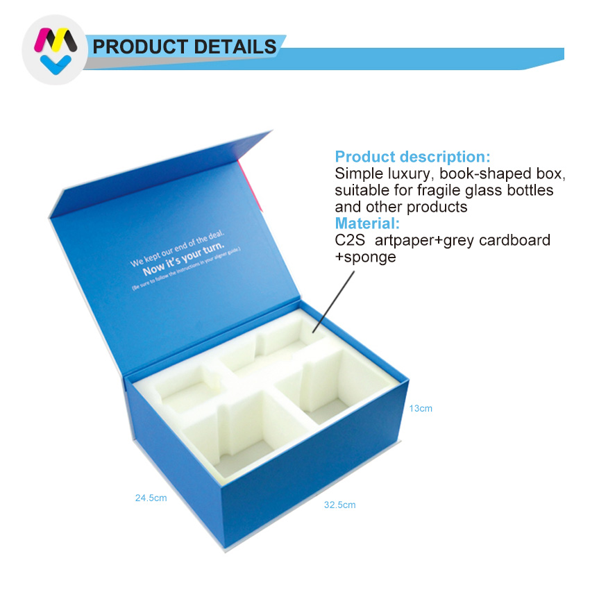Die magnetische Geschenkbox wurde aus 157 g/m² C2S-Kunstdruckpapier hergestellt, das mit 2,5 mm grauem Karton laminiert wurde. Es handelt sich um eine sehr magnetische Geschenkbox mit Farbdruck und matter Laminierung. Sie ist farbenfroh und sieht modisch aus und eignet sich für verschiedene Kosmetikverpackungen.