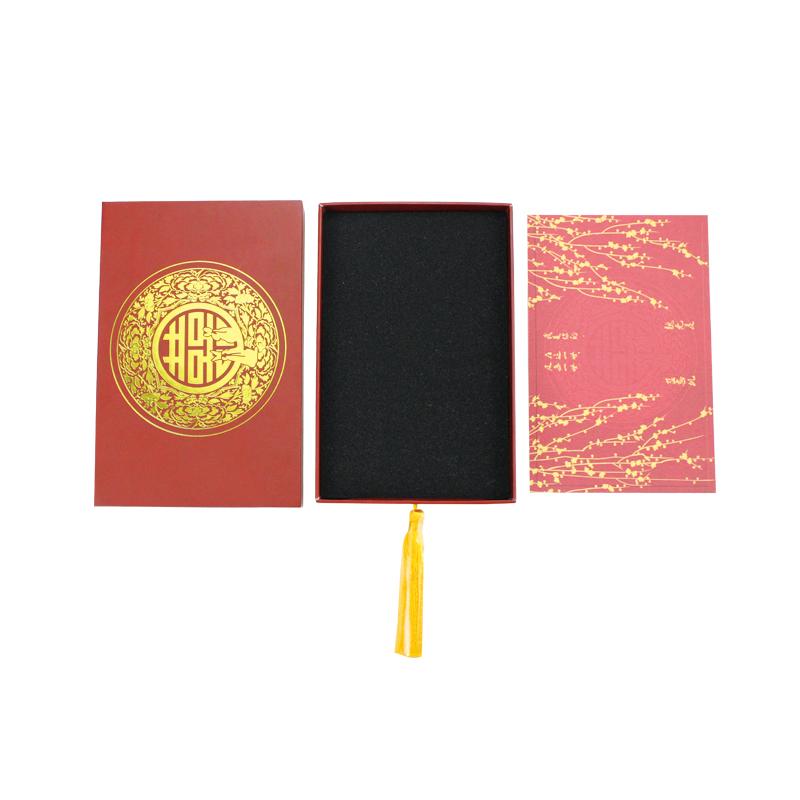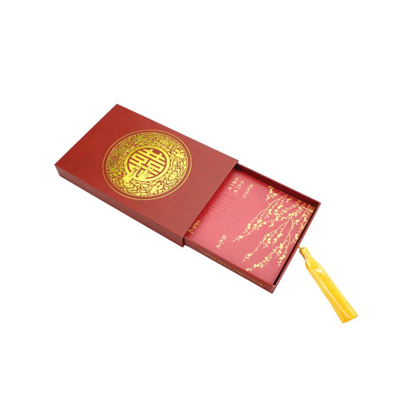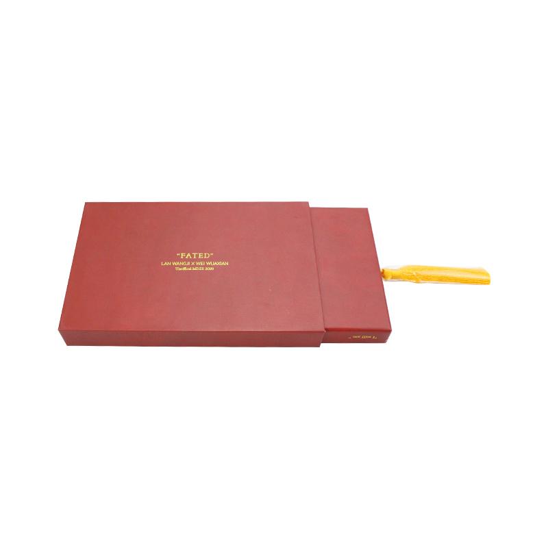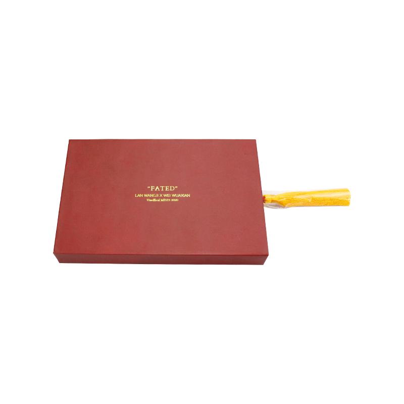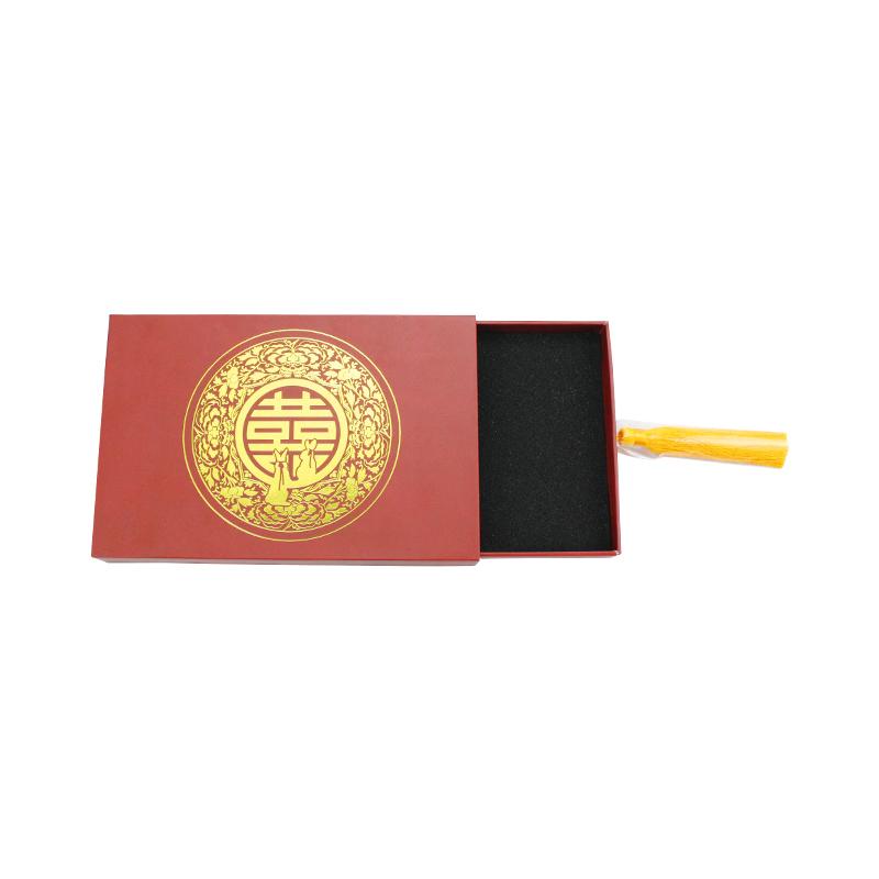 Hochwertige Schubladenbox für Festivaleinladungen im chinesischen Stil mit individuellem Logo, rechteckiger Volldruck mit roter Spotfarbe, goldenes Heißprägelogo mit goldenem Band, matte Laminierungsoberflächenveredelung.