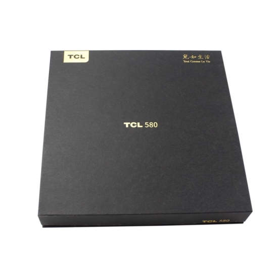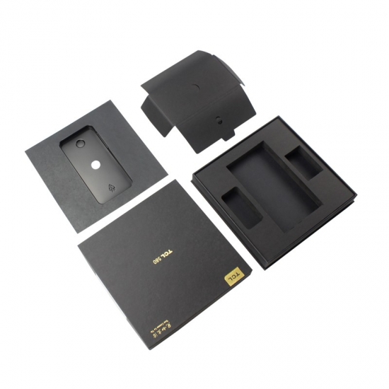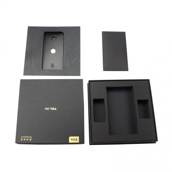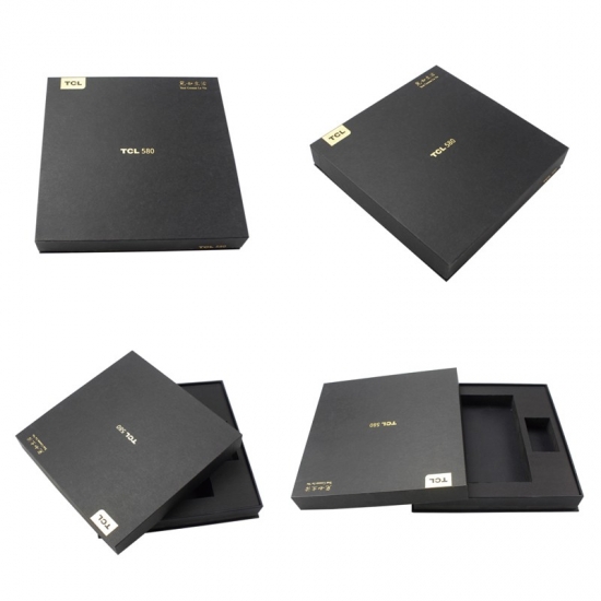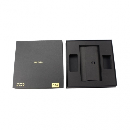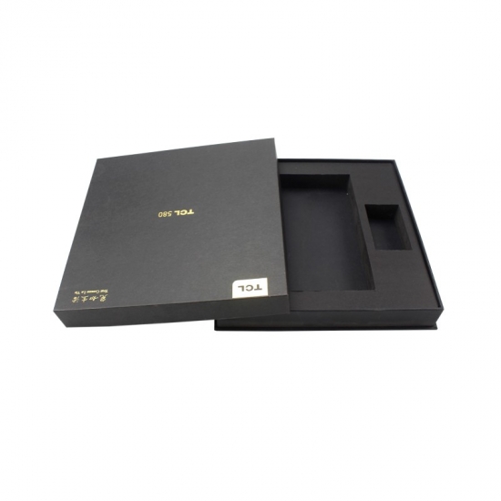 Dies ist eine große, kundenspezifische Geschenkbox aus Papier und Karton mit Deckel für Mobiltelefone, hergestellt aus schwarzem Kartonpapier + 1200 g Graupappe, mit kundenspezifischem Logo in Goldfolienprägung. Im Inneren der Box befindet sich ein schwarzer, robuster Trenneinsatz aus EVA-Schaumstoff zum Halten des Telefons und zum Trennen von Zubehör.