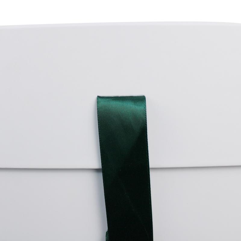 Klassik weiße Geschenkbox mit Band , aus hochwertigem Kunstdruckpapier, montiert auf 1400 g/m² Hartkarton, individuelles Logo in Pantone-Grün gedruckt, mit Band in derselben Pantone-Farbe.