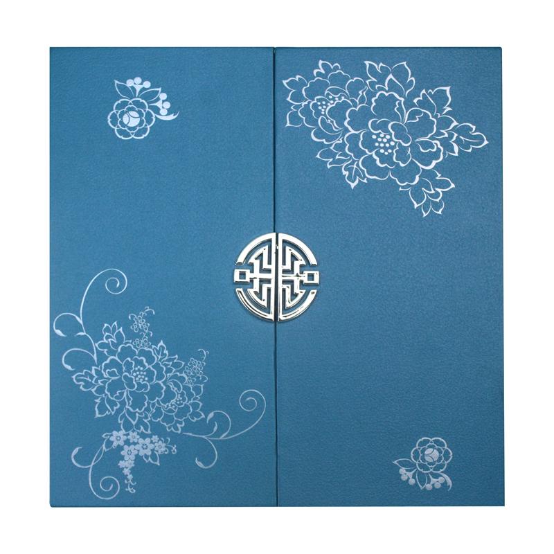 Box-Veredelung: Pantone-Blaudruck, Mattfolienkaschierung, Prägung, Heißprägung mit Goldfolie,