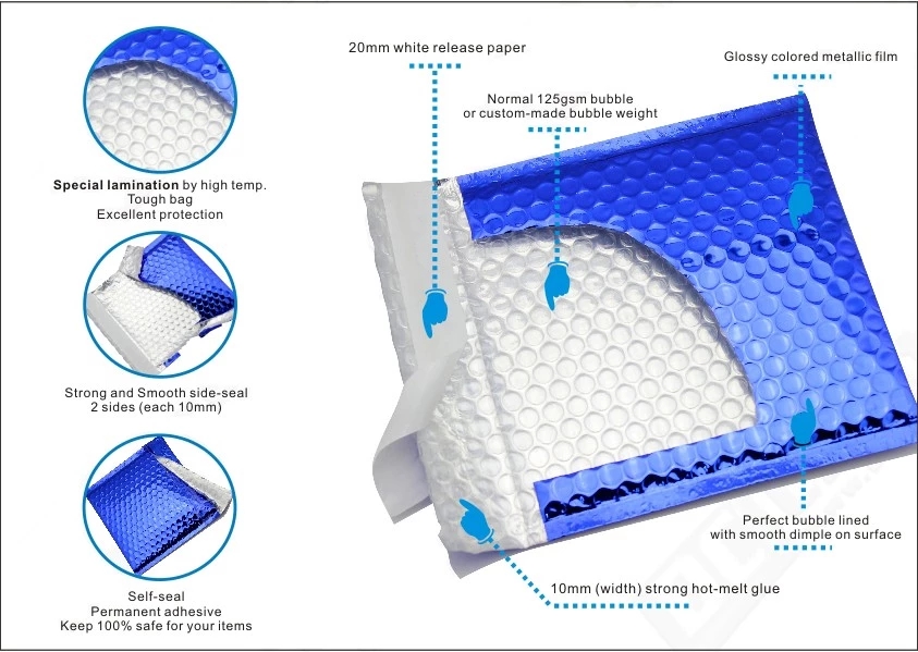 Das Material des Produkts: Aluminiumfolie + Polyethylenblase. Die Farbe der Aluminiumfolie kann angepasst werden, und der Druckinhalt kann ebenfalls angepasst werden