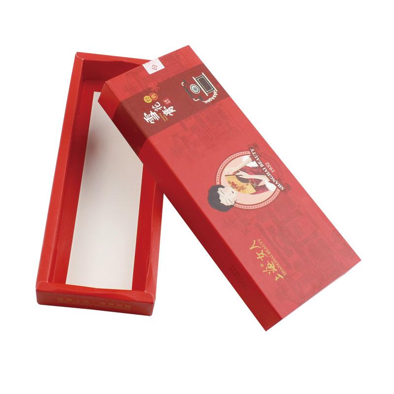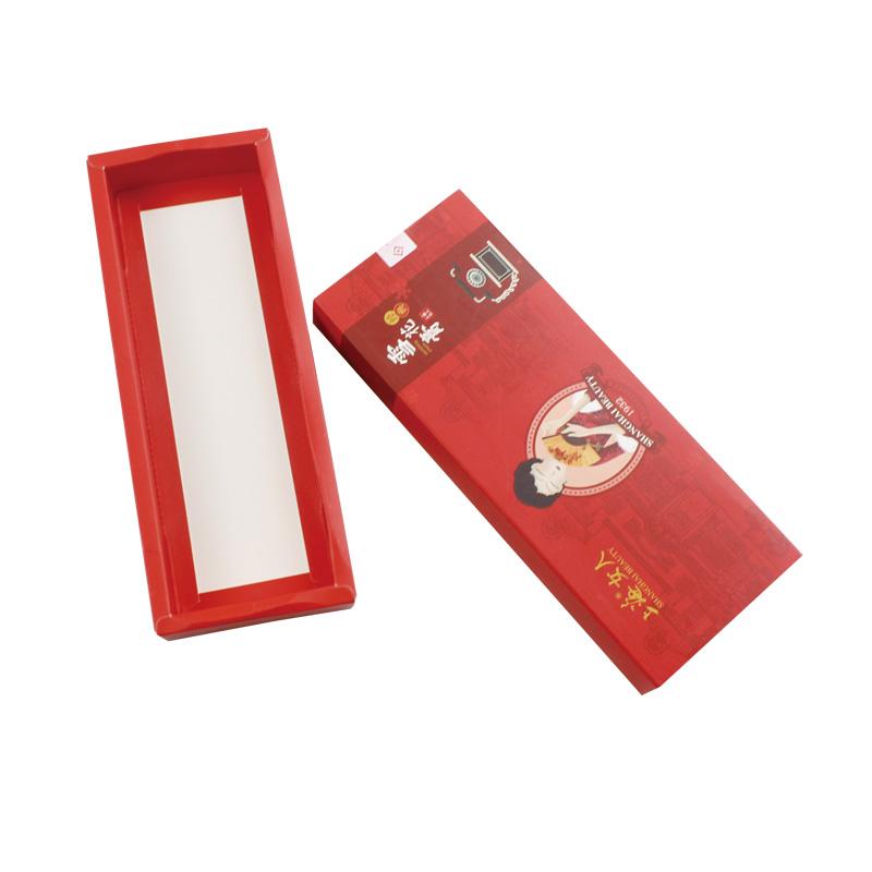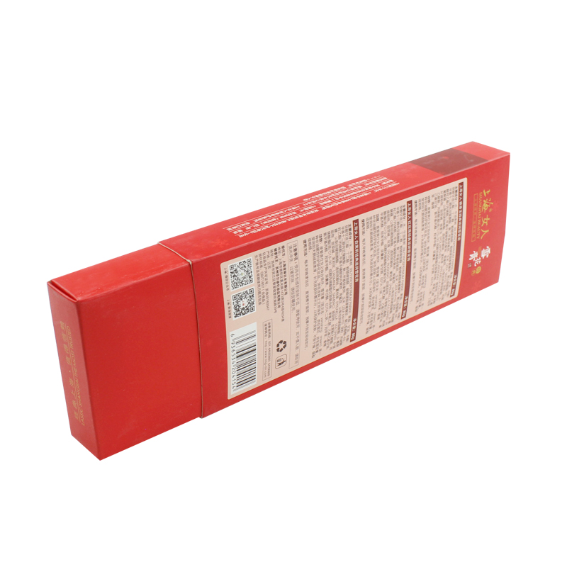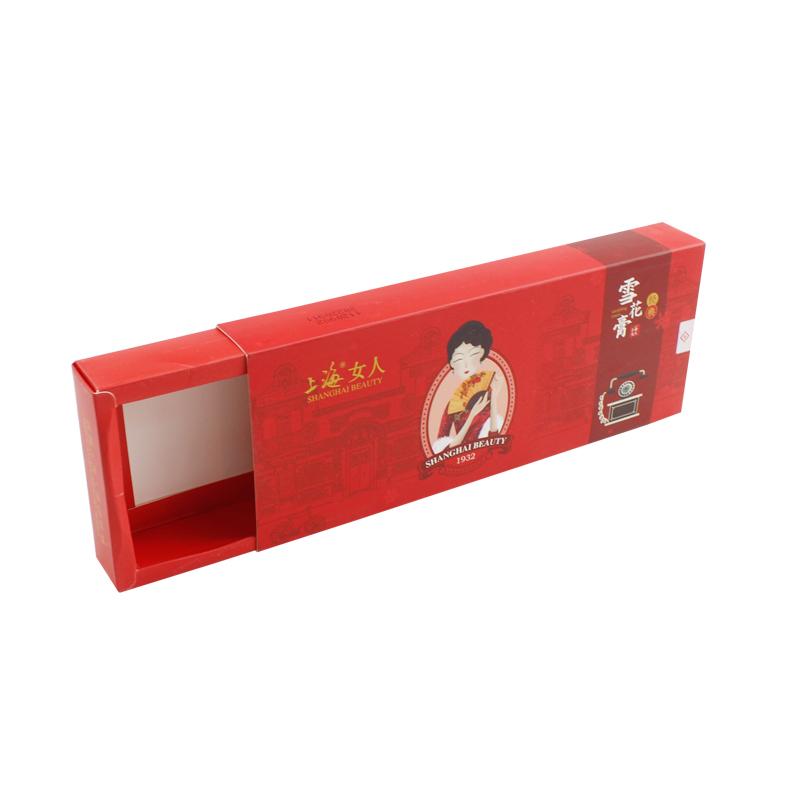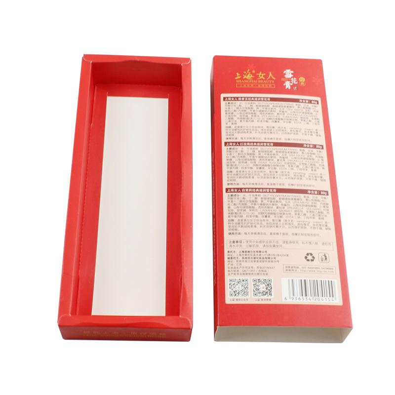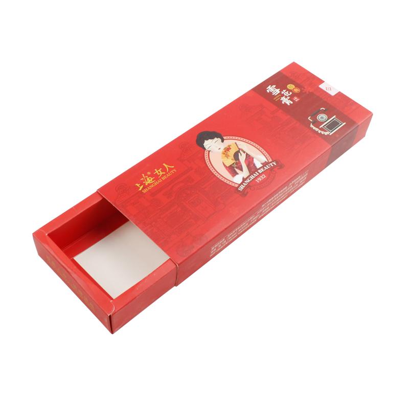 Dies ist ein Flachpackung mit Schubladenbox was machte aus 350 g einseitig gestrichenem Kunstdruckpapier , voller mattroter Farbdruck auf der gesamten Schachtel mit Logo und Text.