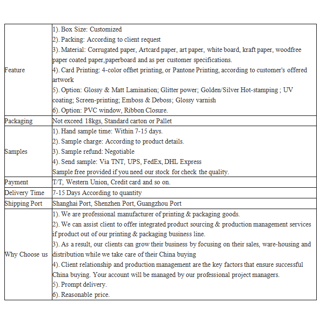 Hinweis: Alle Produktbilder, die wir auf unserer Website veröffentlicht haben, dienen nur als Referenz für die Art der Verpackung, die wir herstellen können. Sie bedeuten nicht, dass wir die gleiche Verpackung wie auf Lager verkaufen. Wir konzentrieren uns auf kundenspezifische Papierverpackungen in jeder Größe, Farbe, Struktur usw.