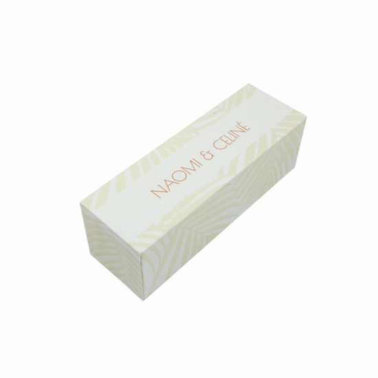 Hellgelbes Kunstwerk in Blattform und rotes Textfolienlogo, sehr filigrane Kosmetik- und Hautpflegebox mit Schublade im individuellen Design. Hergestellt aus 157 g Kunstdruckpapier + Graupappe, geprägtem Blattmuster + matter Laminierung mit Bandzieher.