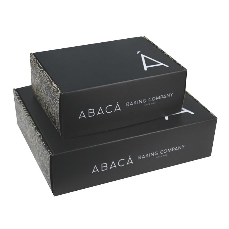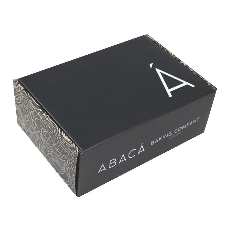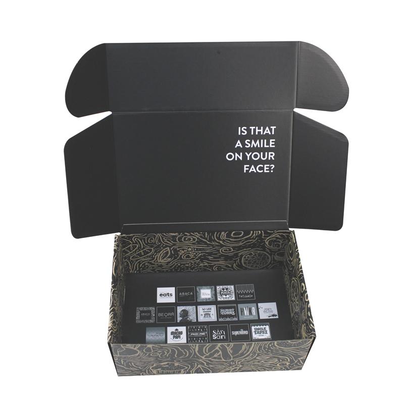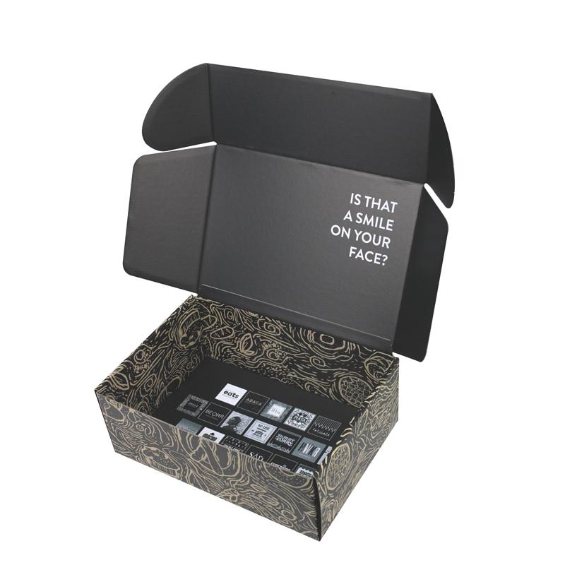 Werkseitig individuell bedruckte Versandkartons aus mattschwarzer Wellpappe