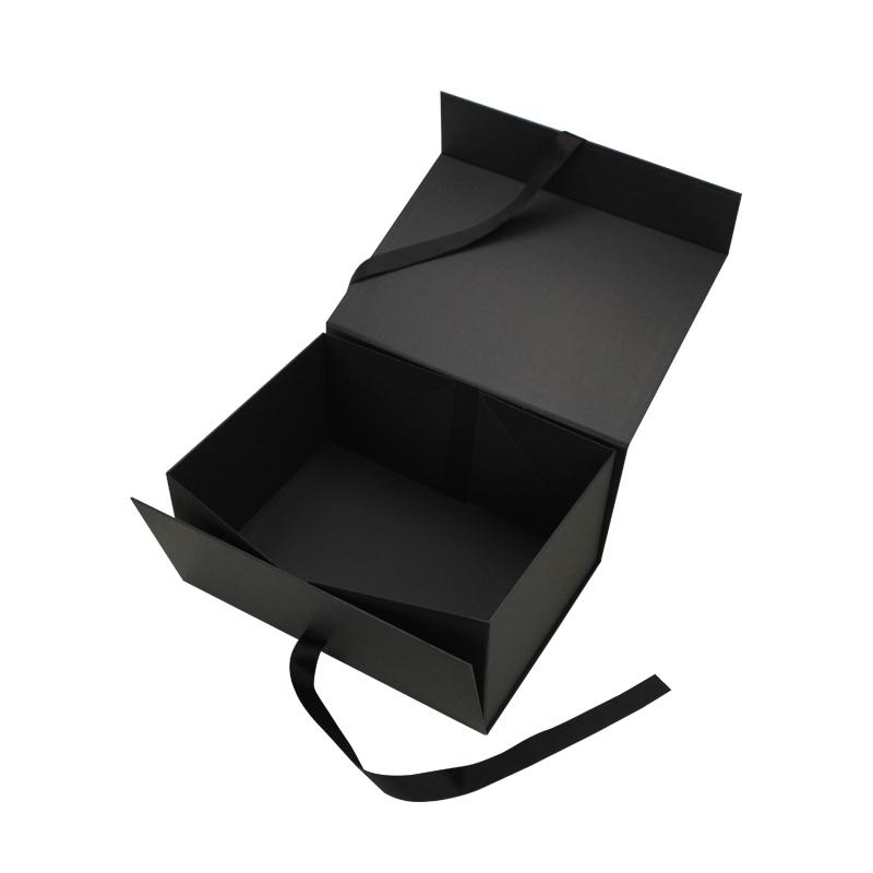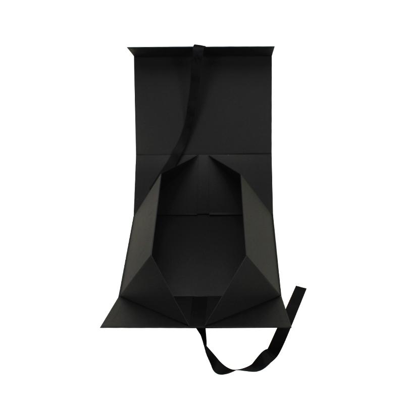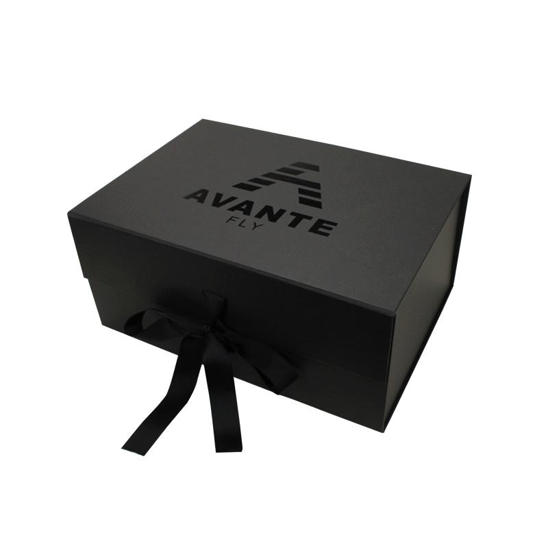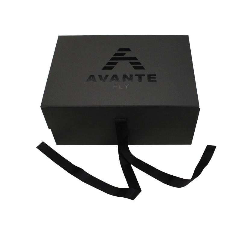 Schick Faltbare Schuhkartons Hergestellt aus 120 g/m² schwarzem Papier, laminiert mit 2 mm starkem Karton. Vollständig schwarze Schachtel mit schwarzem Band. Individuelles Logo mit Spot-UV-Beschichtung. Manche Kunden bevorzugen auch Heißprägungen und Prägungen mit Goldfolie auf schwarzen Faltschachteln. Jede Veredelung ist als Sonderanfertigung möglich.