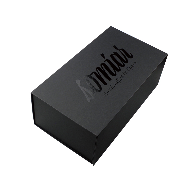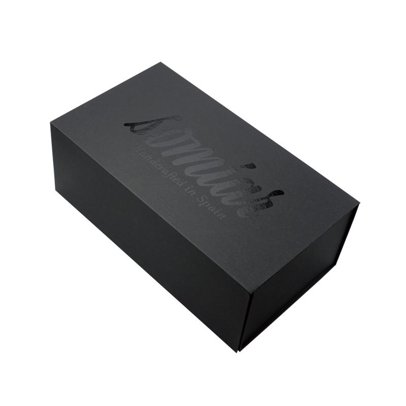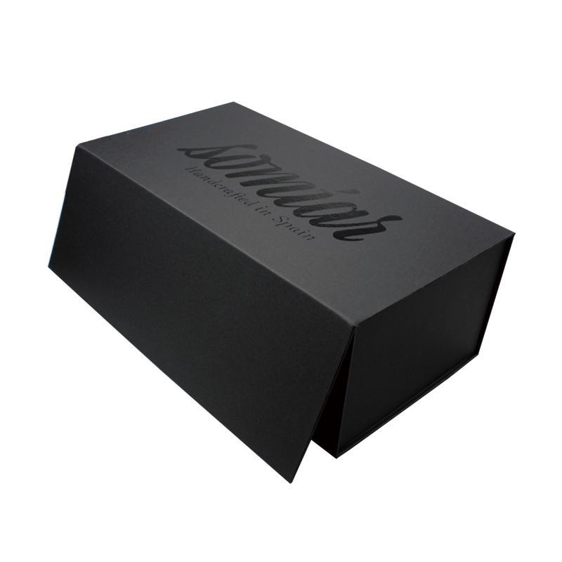 Dies ist ein tragbares und hochwertiges faltbare schwarze magnetische Papierboxen gemacht aus schwarzem Spezialpapier + 2 mm dickem Graukarton, Logo in Großformat und UV-Beschichtung auf der Oberseite des Deckels ohne Aufdruck.