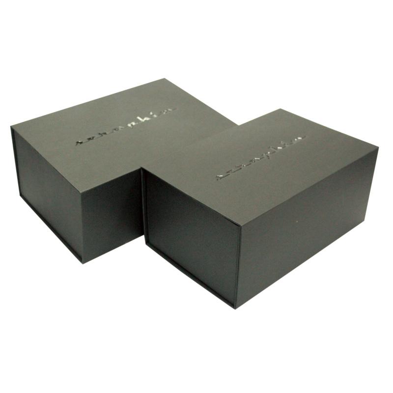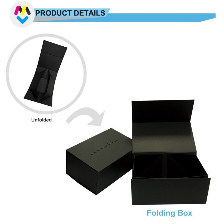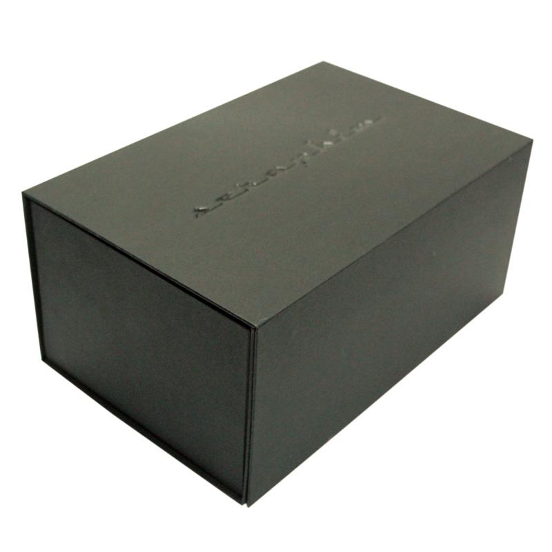 Dies ist ein faltbare große magnetische Verpackungsboxen was machte aus speziellem schwarzem Papier + 1200 g Graupappe, das Logo auf der Oberseite des Deckels ist geprägt + UV-Beschichtung. Wir können die Größe nach Ihren Wünschen anpassen.