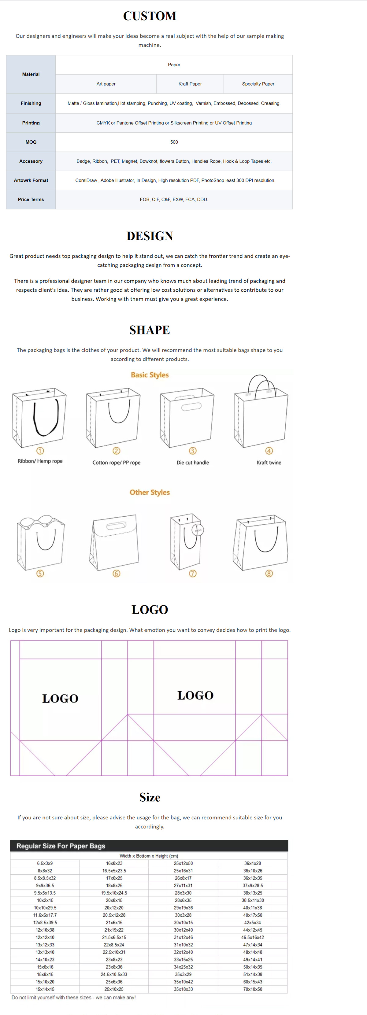 Ob Sie eine Papier Drehgriff, ein flacher Klappgriff oder gar kein Griff, wir können individuell bedrucken Papiertüten für Sie. Wir können auch benutzerdefinierte drucken dein Design oder Logo auf Kartons, Tissue Papier , Etiketten und Verpackungen Papier .
