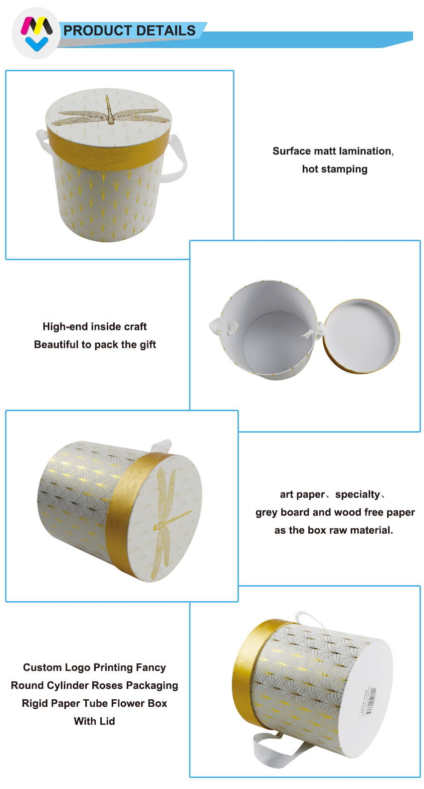 Dies ist eine große, dekorative, runde Geschenkbox mit wunderschönem Muster, Ober- und Unterseite aus 157 g C2S-Kunstdruckpapier und 1200 g Graupappe. Das Libellen-Logo auf dem Deckel verleiht der Box ein lebensechtes Aussehen und der Griff aus Band erleichtert das Herausnehmen.