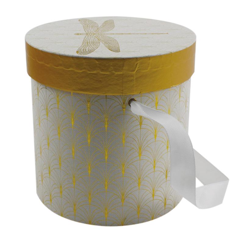 Individuell gestaltete, große, dekorative, runde Geschenkbox mit wunderschönem Muster und Deckel. Das Libellen-Logo auf dem Deckel verleiht der Box ein lebensechtes Aussehen.