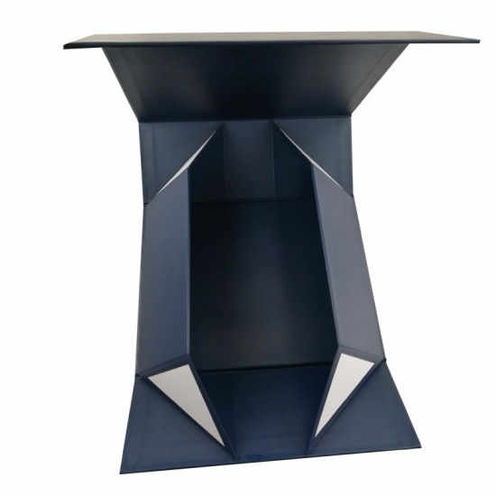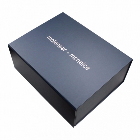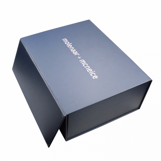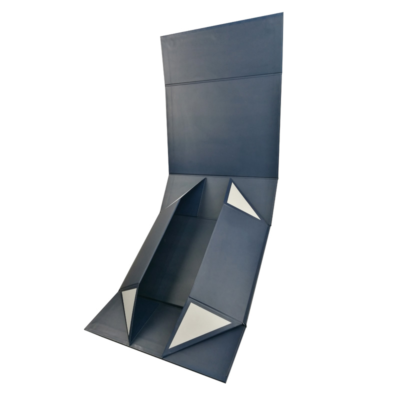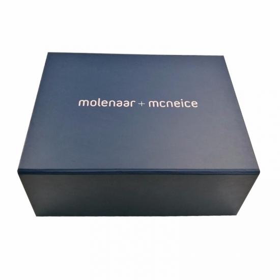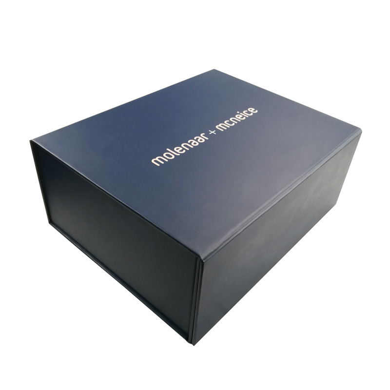 Dies ist eine matte blaue Farbe große flache Faltschachteln was machte aus 157 g C2S-Kunstdruckpapier + 1200 g Graupappe, Vollfarbdruck auf der Außen- und Innenseite der Schachtel mit aufgeprägtem Logo in Goldfolie, an den vier Ecken der Basisschachtel befinden sich doppelte Klebebänder.