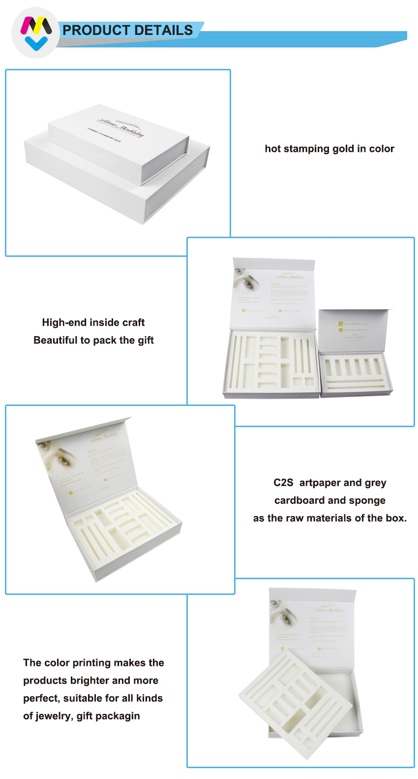 Dies ist ein Verpackungsbox mit Trennwänden was machte aus 157 g C2S-Kunstdruckpapier + 2 mm Graupappe, das Logo auf der Oberseite der Schachtel ist ein Folienprägung in verschiedenen Farben, die der Schachtel ein glänzendes und luxuriöses Aussehen verleihen. Die Innenpolsterung der Schachtel besteht aus einem individuell geformten weißen Schwamm mit Samt.