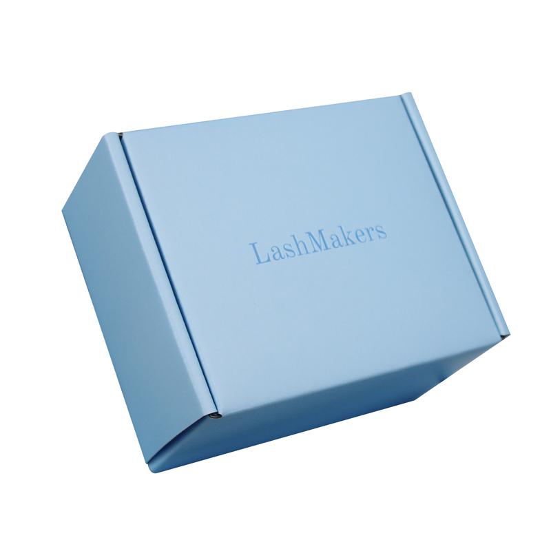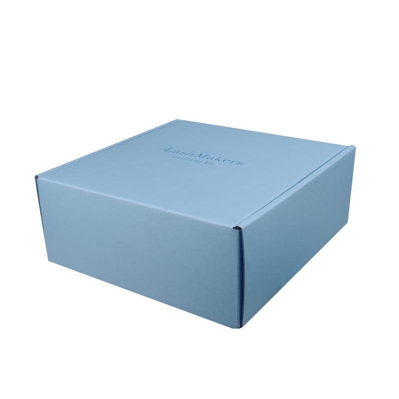 Das Flacher Versandkarton besteht aus 300 g/m² CCNB-Papier, montiert mit Strangthen E-Welle und innen 300 g/m² CCNB. Sowohl außen als auch innen in Pantone-Blau bedruckt, mit tiefblauem und geprägtem Logo.