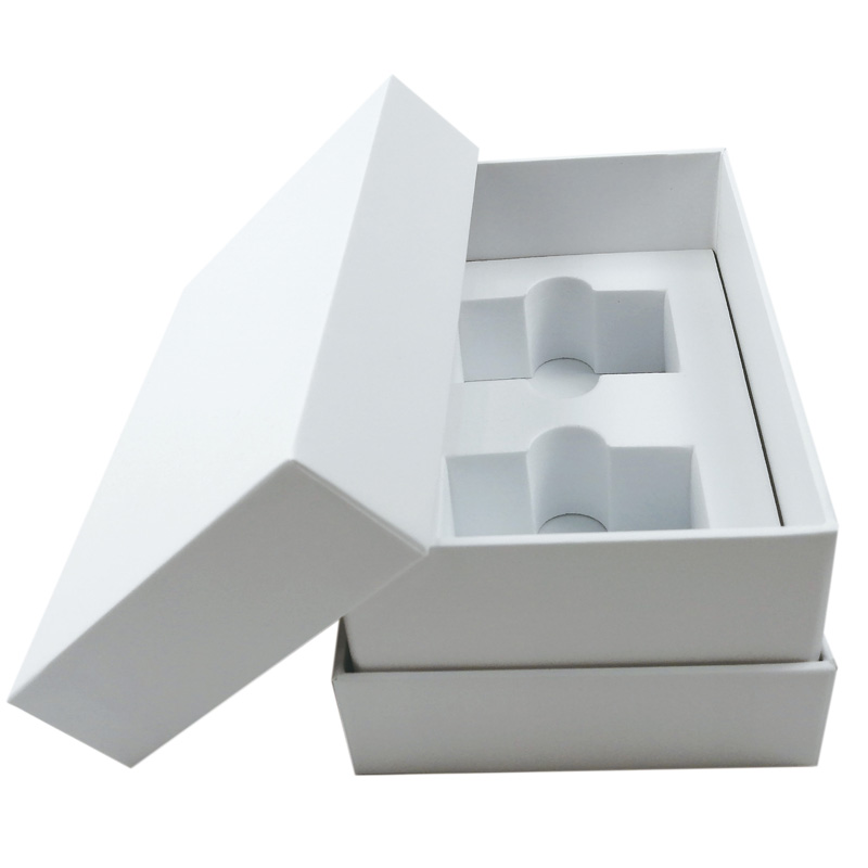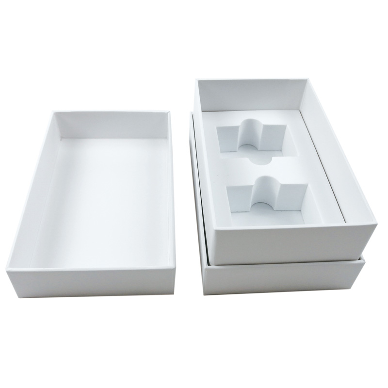 Dies ist ein weißer Deckelkarton Kasten was machte aus 157 g C2S-Kunstdruckpapier + 1200 g Graupappe, Boden mit Manschette, Innenseite der Box mit individuell geformter weißer EVA-Polstereinlage.