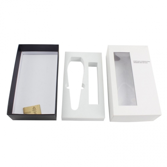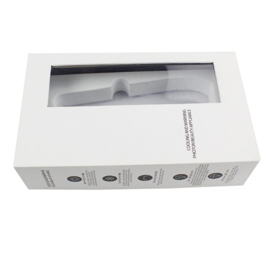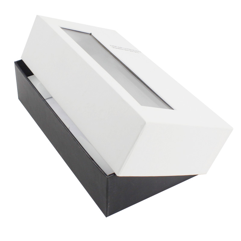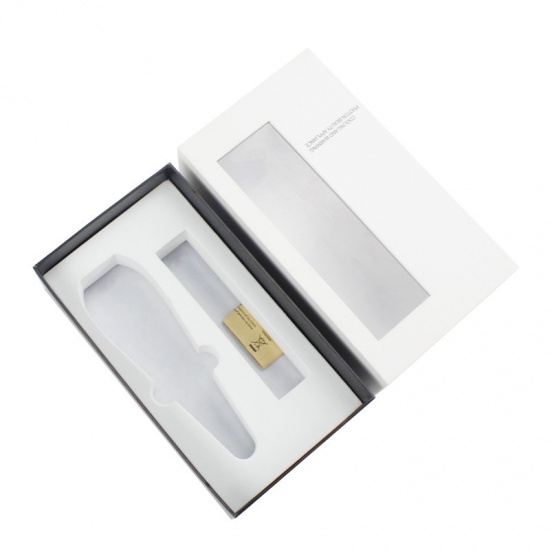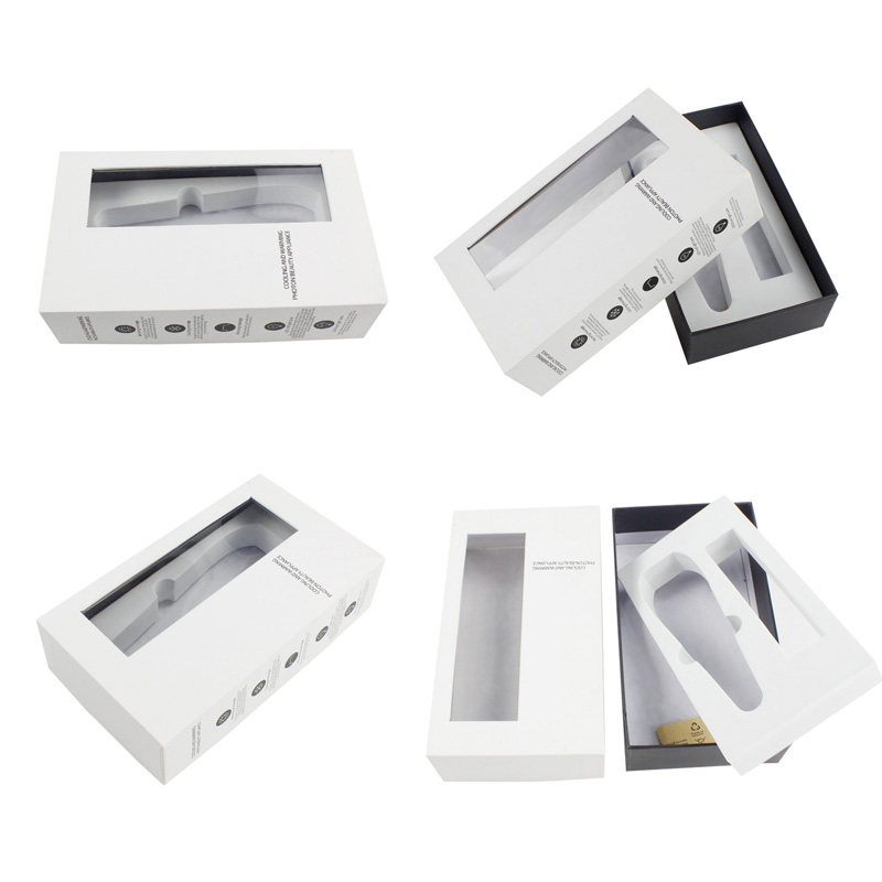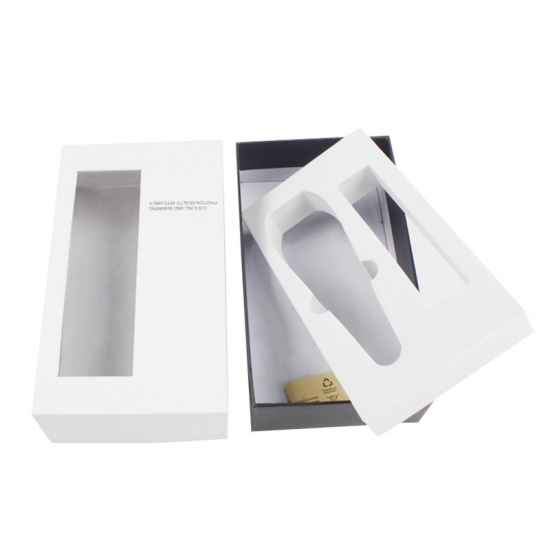 Dies ist ein Deckel und Boden Kasten was machte aus 157 g C2S-Kunstdruckpapier + 1200 g Graupappe, am Deckel ist ein transparentes PVC-Fenster angebracht, um die Produkte im Inneren zu zeigen, im Inneren der Schachtel befindet sich eine individuell geformte weiße EVA-Polstereinlage.