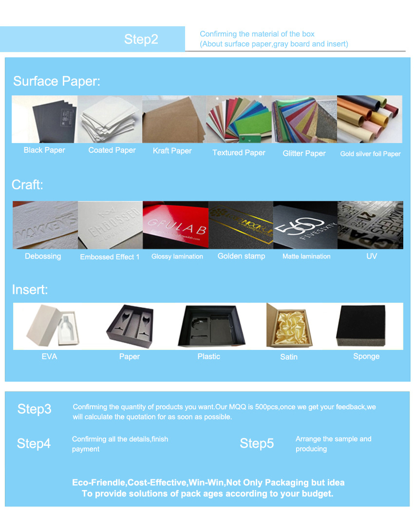 5). Option: Glänzende und matte Laminierung; Glitzerkraft; Heißprägung in Gold/Silber; UV-Beschichtung; Siebdruck; Prägen und Tiefprägen; Glänzender Lack