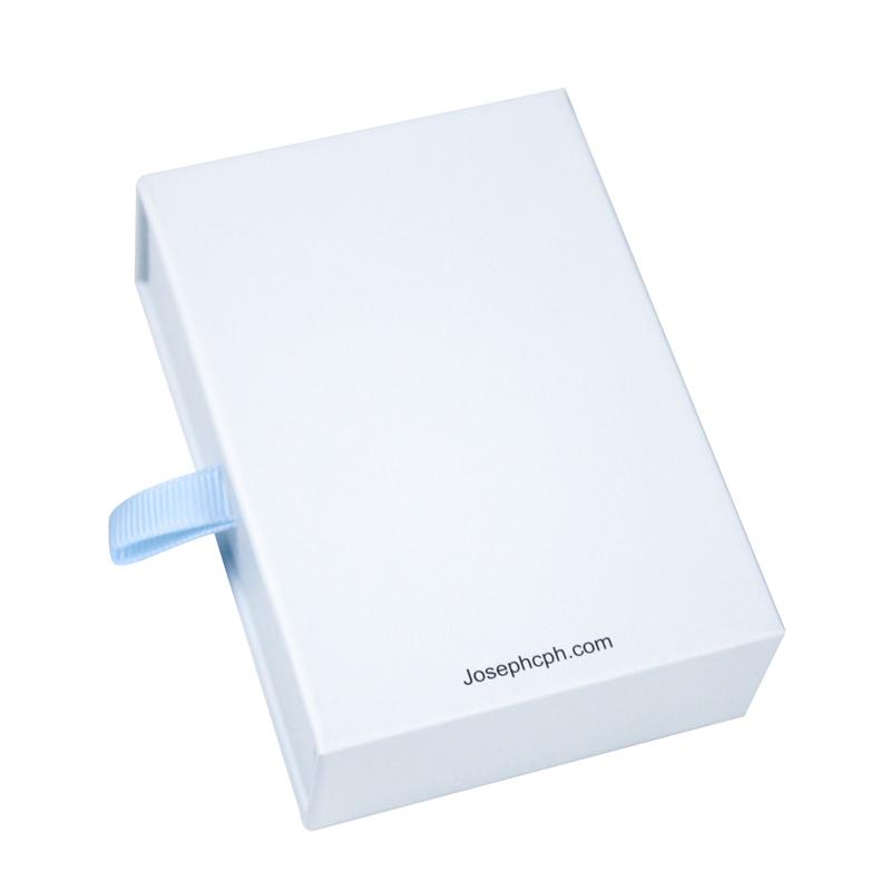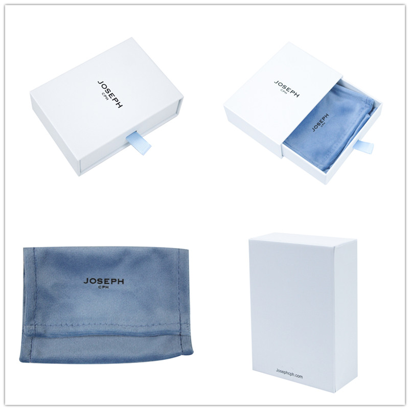 Dies ist eine maßgeschneiderte Schmuckschatulle aus Papier im Schubladenstil mit Mikrofaserbeutel. Wir können sie je nach Kundenwunsch mit unterschiedlicher Papierstruktur und Farbe herstellen. Das Logo kann auf die Schmuckschatulle oder den Beutel gedruckt, heißgeprägt, tiefgeprägt oder geprägt werden.