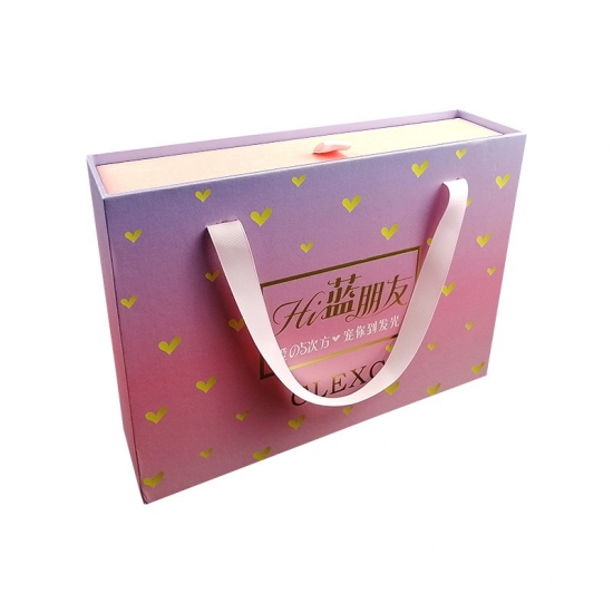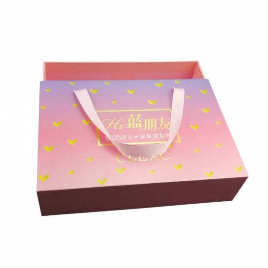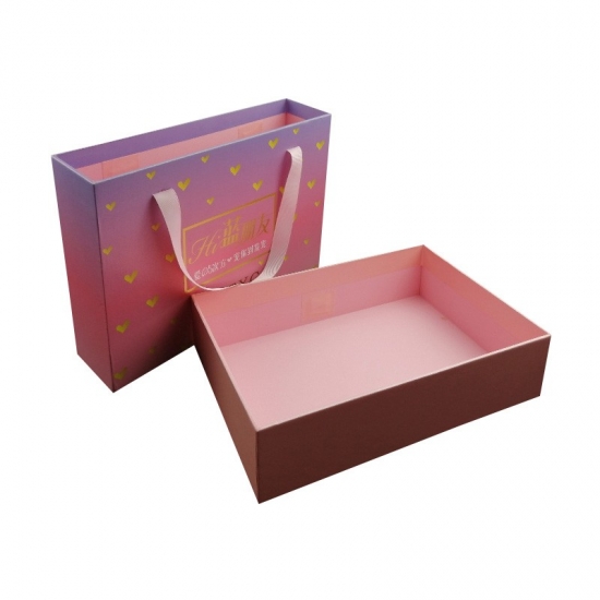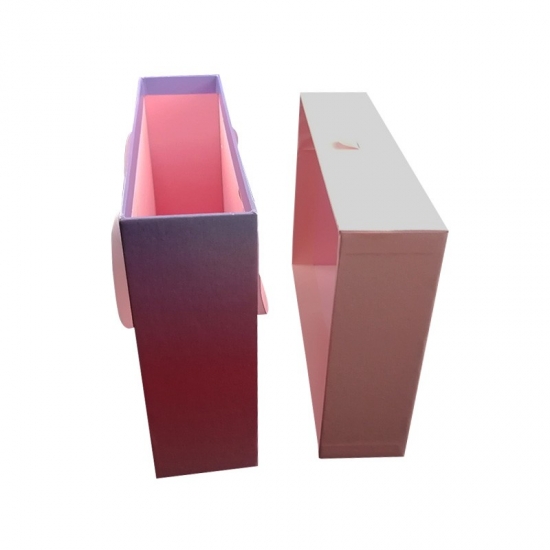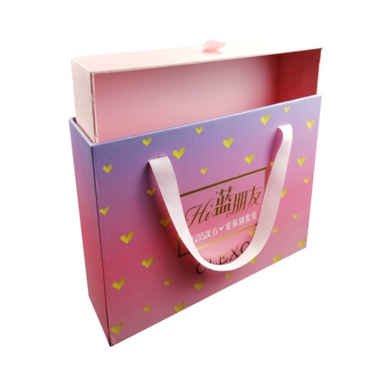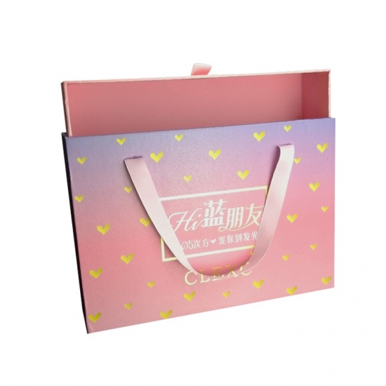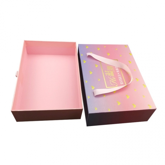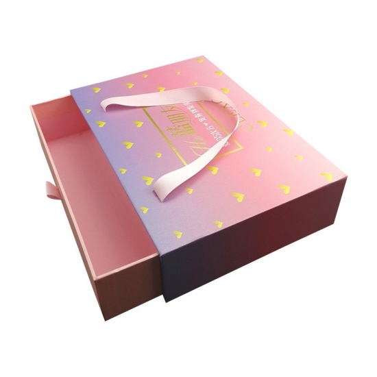 Es handelt sich um eine große rosafarbene romantische Geschenkbox mit Schiebeschublade und Bandgriff. was machte von 157 g C2S-Kunstdruckpapier + 1200 g Graukarton , Außenseite der Box mit vollem Grafikmusterdruck, Basisbox mit schlichtem rosa Druck und matter Oberfläche.
