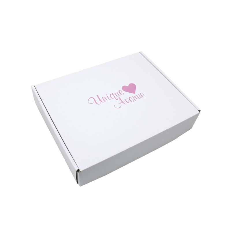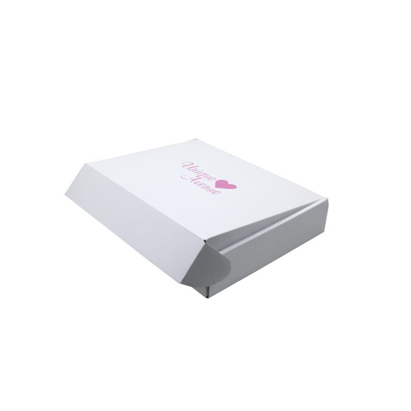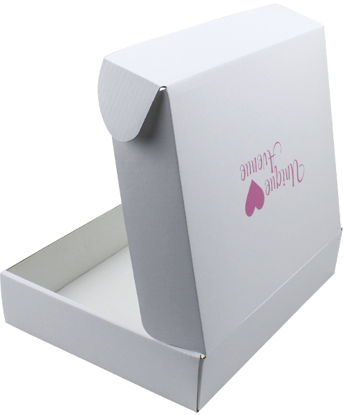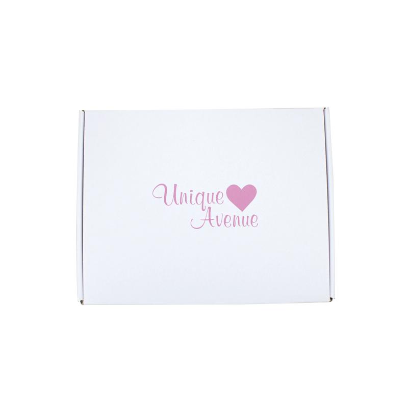 Dies ist ein weißer, dreilagiger Wellpappkarton aus 300 g CCNB+WE-Welle. Er kann als flacher Versandkarton verwendet werden. Das Logo ist in der Mitte der Oberseite des Kartons in Rosa aufgedruckt.
