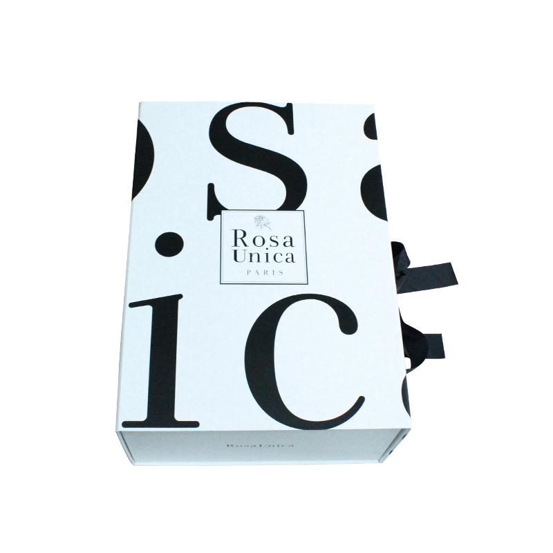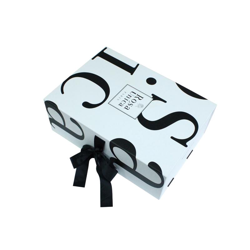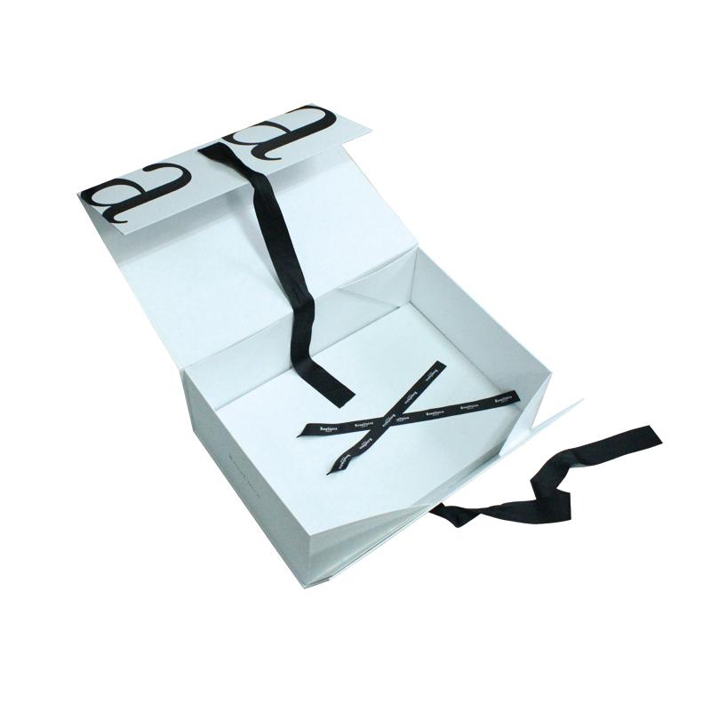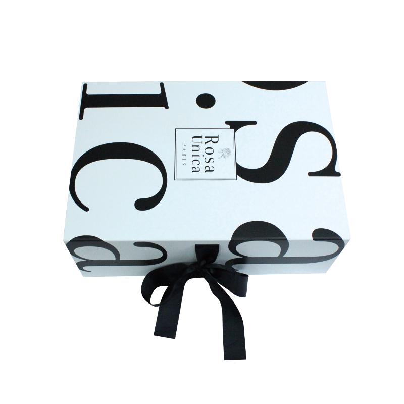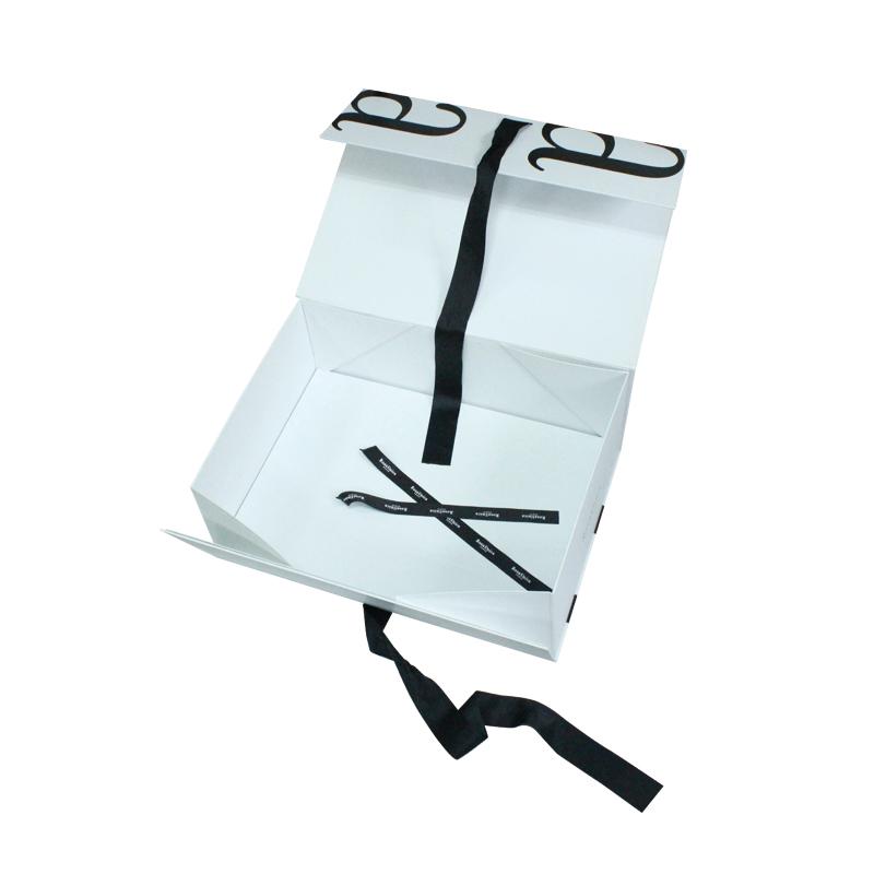 Dies ist eine große, weiße, flache, faltbare Geschenkbox aus Spanplatte mit schwarzem Logo und Schleife. Hergestellt von 157 g C2S-Kunstdruckpapier + 1800 g starker Graukarton und die innere Schachtel hat ein längeres Band, das durch die vier Ecken der Schachtel verläuft, um die Schachtel zu verstärken. Das schwarze Band passt zur Logofarbe.