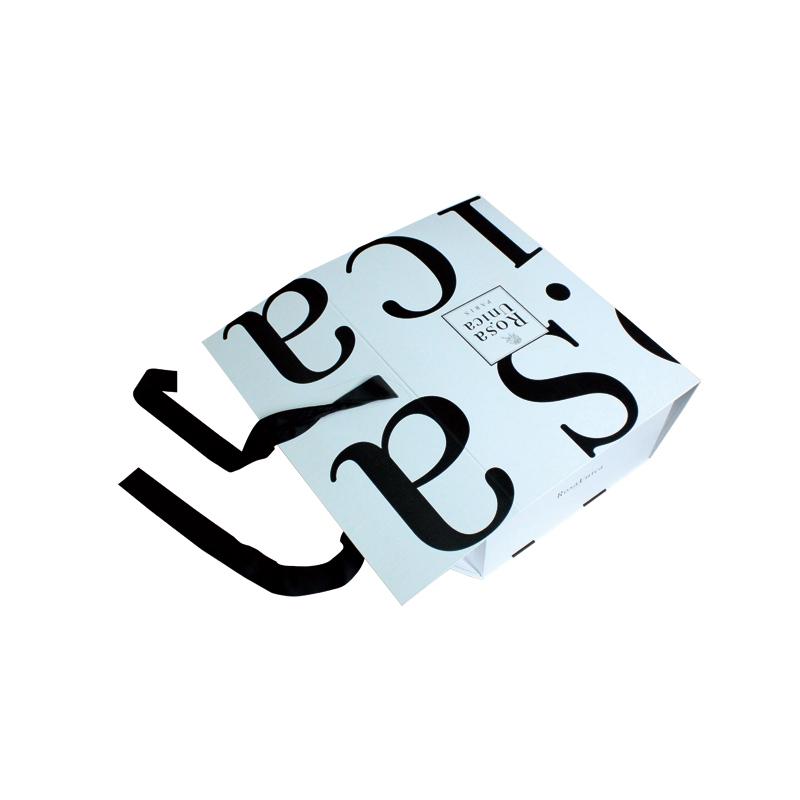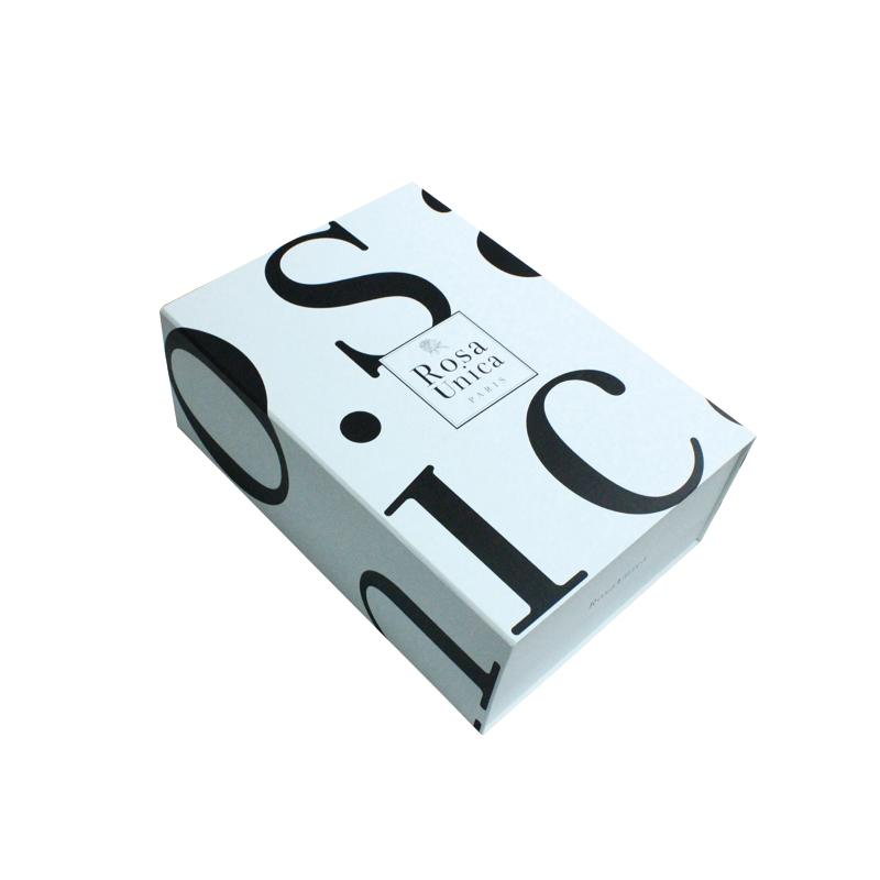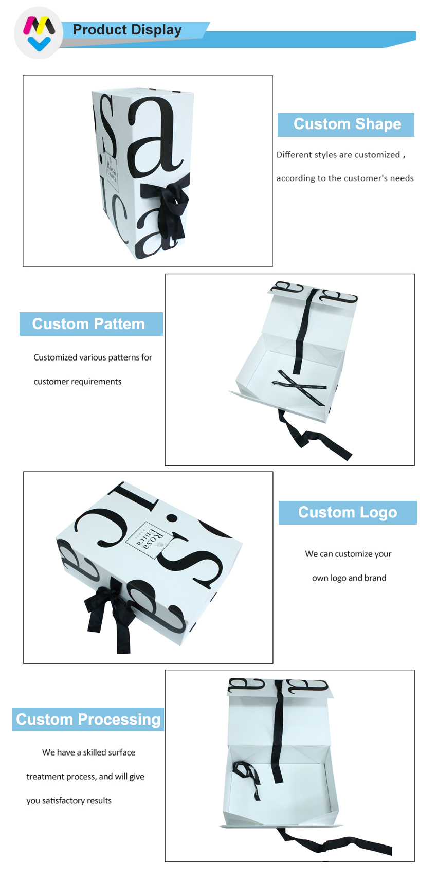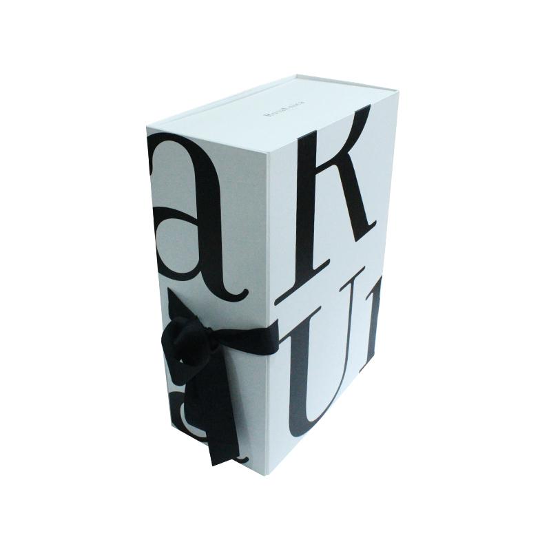 Dies ist eine große, weiße, flache, faltbare Geschenkbox aus Spanplatte mit schwarzem Logo und Schleife. Hergestellt von 157 g C2S-Kunstdruckpapier + 1800 g starker Graukarton und die innere Schachtel hat ein längeres Band, das durch die vier Ecken der Schachtel verläuft, um die Schachtel zu verstärken. Das schwarze Band passt zur Logofarbe.