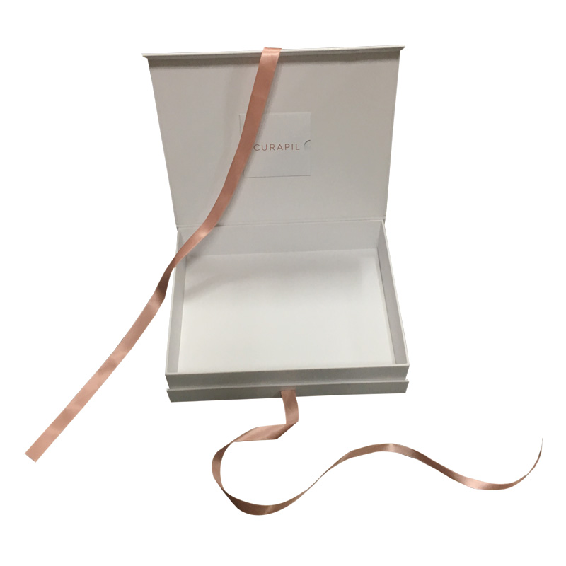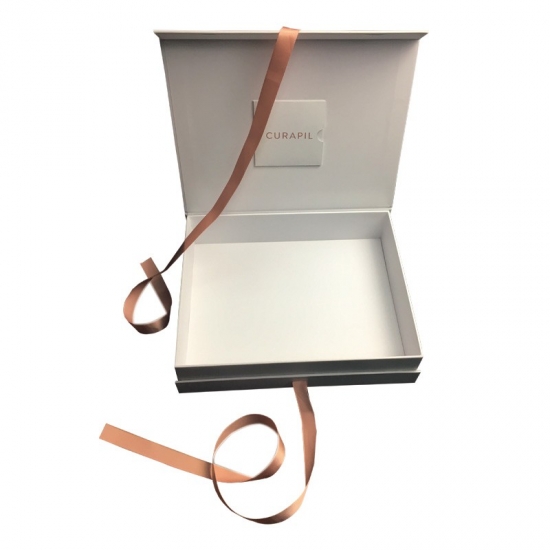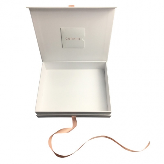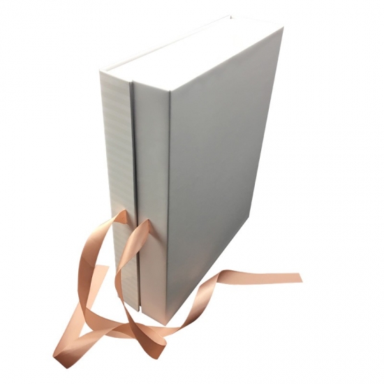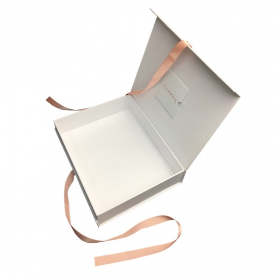 Dies ist ein weißes magnetische Geschenkbox mit Schleife was machte aus 157 g C2S-Kunstdruckpapier + 2 mm Graupappe, Außenseite der Schachtel voller UV-Beschichtung, die der Schachtel ein glänzendes und luxuriöses Aussehen verleiht, Innenseite des Deckels mit kleinem Umschlag zum Einlegen der Karte.