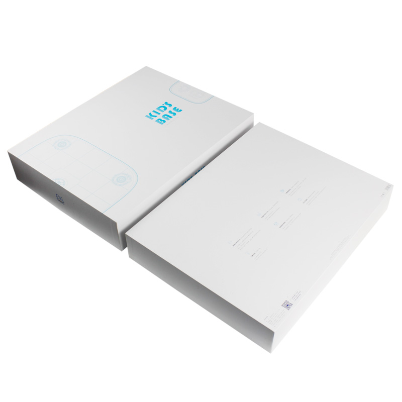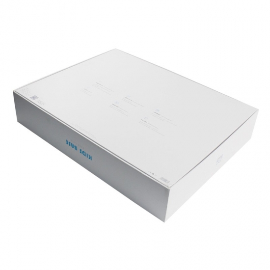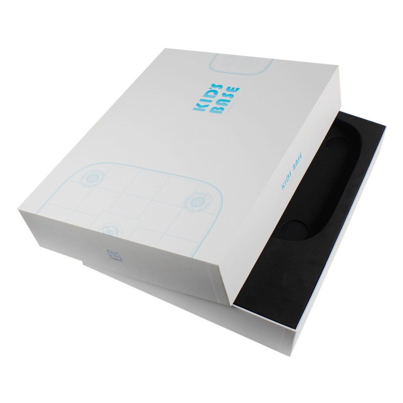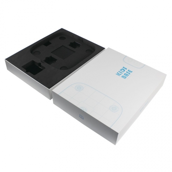 Dies ist ein oben und unten Kasten was machte aus 157 g C2S-Kunstdruckpapier + 1200 g Graupappe, blauer Logo-Texturdruck auf der Schachtel, Innenseite der Schachtel mit individuell geformter schwarzer Schaumstoffpolstereinlage.