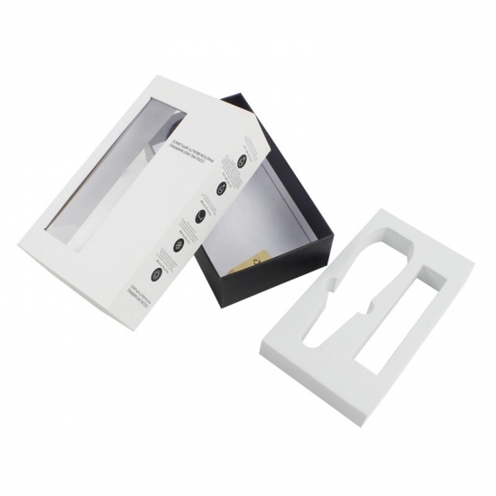 Weiße Schachteln mit Deckel bestehen aus 157 g/m² starkem Kunstdruckpapier und 2 mm dicker Graupappe mit gestanztem EVA-Einsatz.